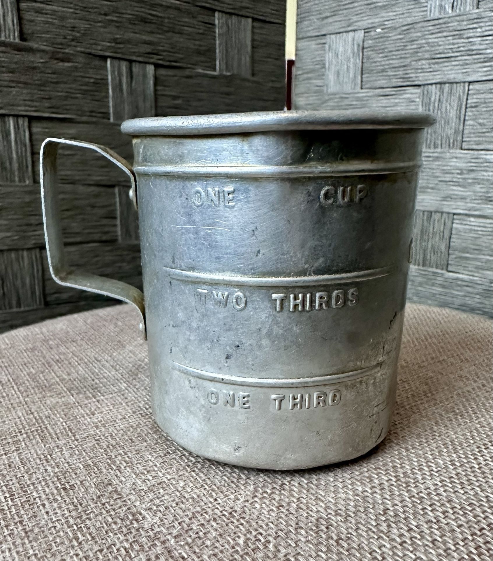 This charming vintage aluminum measuring cup holds one cup and features embossed measurement markings for easy use and timeless appeal. With its utilitarian style and aged patina, it’s perfect for rustic kitchen displays, farmhouse decor, or everyday vintage cooking. Sturdy and simple, this piece is a nostalgic nod to classic American kitchens. (I have 500+ other items listed, you can also DM for appt or visit https://offerup.com/redirect/?o=aHR0cHM6Ly9wYXN0bWVldHNwcmVzZW50YXRsLmV0c3kuY29t)
