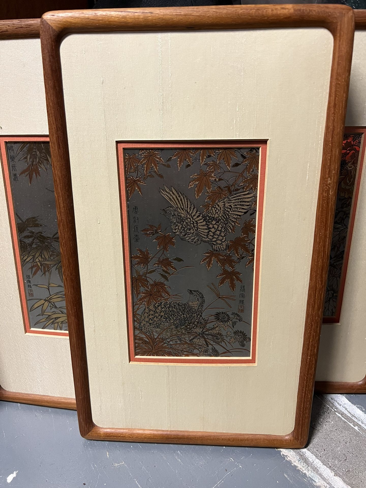 Gorgeous teak wood framed vintage piece from the 1980. This ad is for the “Vintage a The Quail of The Golden Maple Etching.” On the back is the certificat of authenticity stating This was created by Zhang Shou-Cheng for Franklin Mint in 1983. This beautiful etching is made with pure silver and 24kt gold etched on copper. Teak frame. It's in gorgeous shape! Dimensions: 15 inches tall and 8.5 inches wide. Signed!