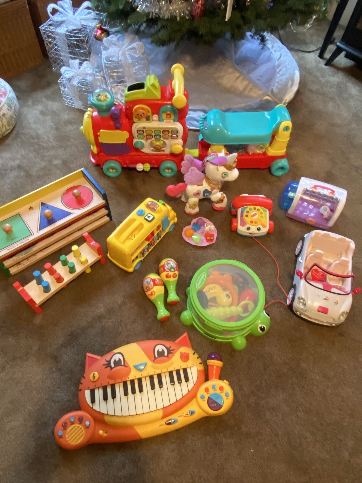 Package deal everything in picture. V tech learning train Leap frog Learning bus Learning unicorn B toys cat piano Wood n things shape animal and clock puzzles Fisher price phone Music set complete Barbie car Pet hamster cage battery operated Blippi wooden puzzles set of 3 Everything works