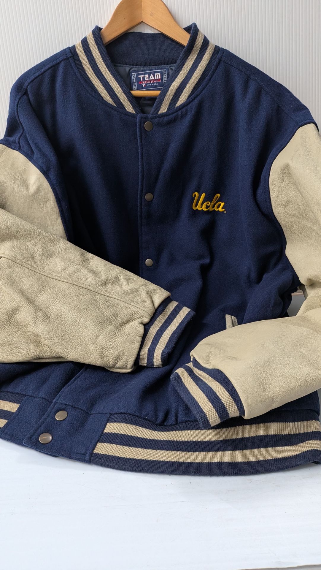 Classic UCLA wool & leather Varsity Jacket. Navy and gold trim stitched letters fully lined including interior pocket.
