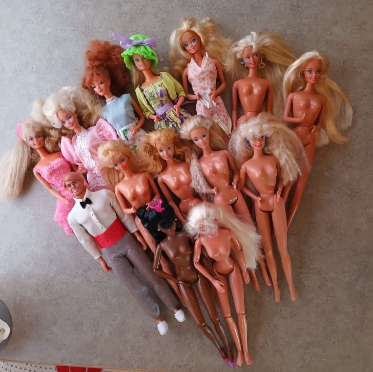 Some are dressed. Most are in good condition. The one in green and purple has a damaged hand. 14 dolls total