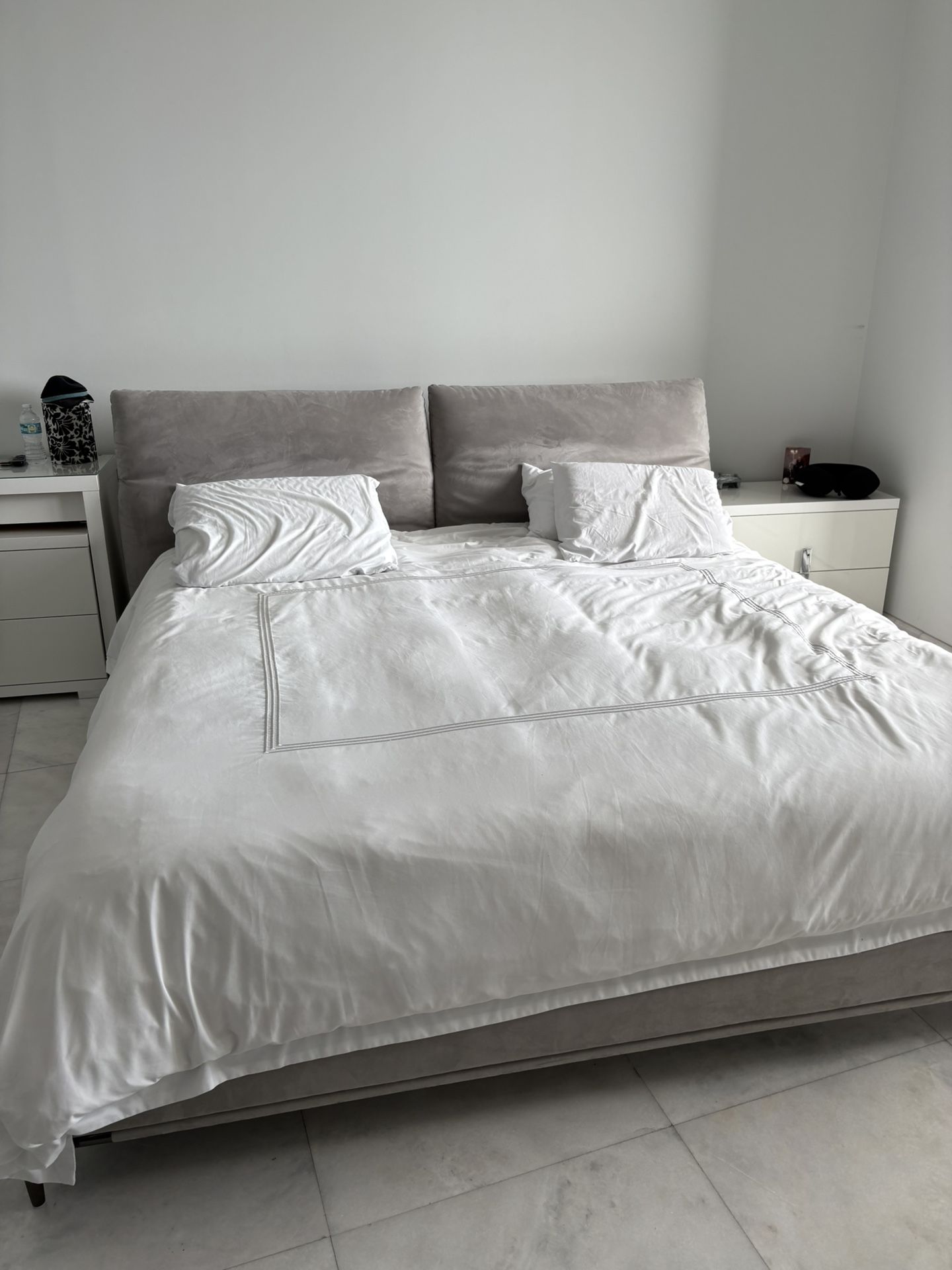 Beautiful suede material headboard very beautiful and comfortable. Super soft. A bit banded at the bottom on the left side.