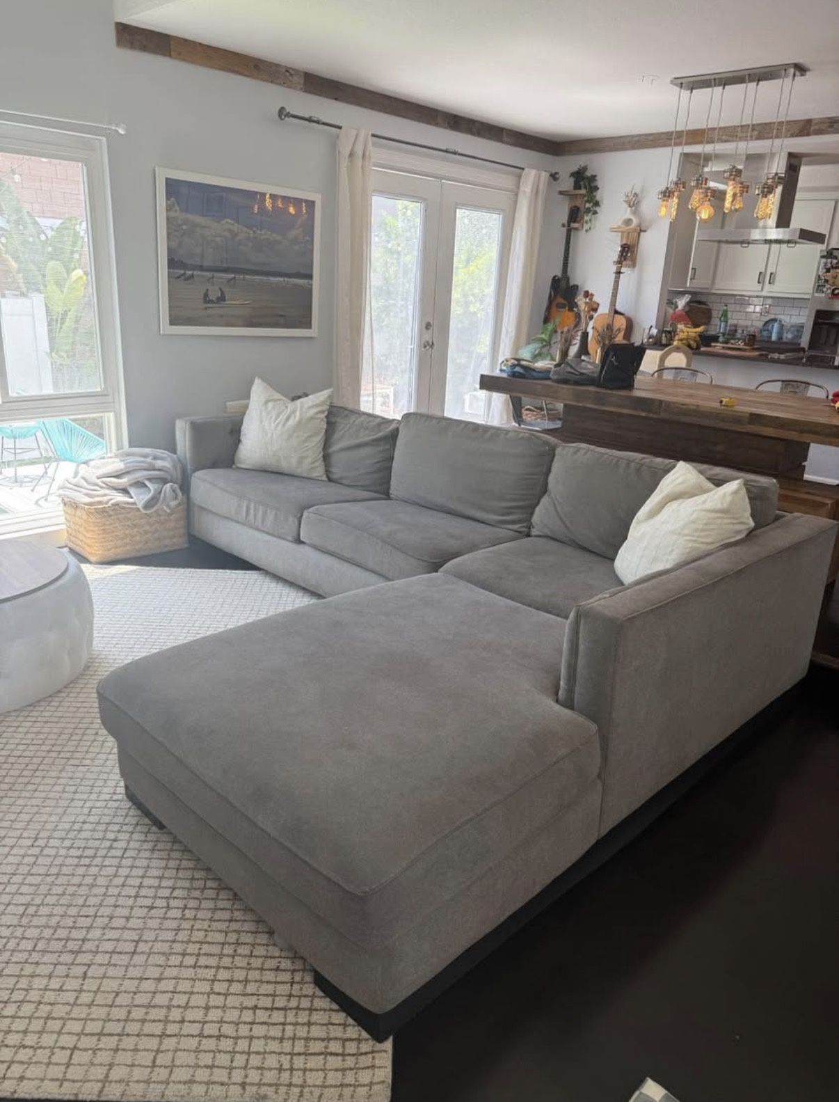 Super comfortable, gray sectional couch with extra large chaise. 3 seater + chaise Some wear and tear that can be easily fixed with a cleaning, some rips on pillows as pictured but also easily fixed Chaise comes un-clicked from rest of couch for ease of transport. Must be picked up and will require more than one person to carry out, and large enough vehicle.