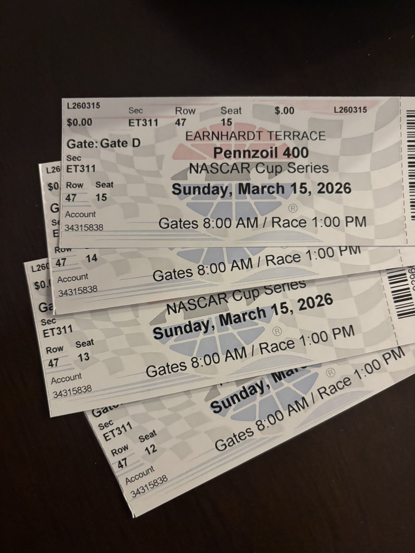 Selling NASCAR tickets for Sunday, March 15 at Las Vegas Motor Speedway. I have seats in: • Dale Earnhardt Terrace • Richard Petty Terrace Great views of the track and perfect for race fans who want to be in the action. Price: $50 each Delivery: Meet up in person (Las Vegas area)