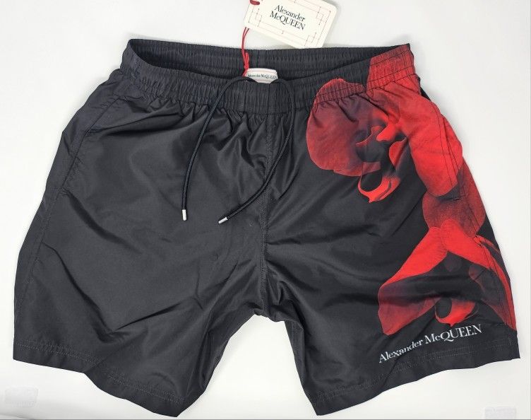 Alexander McQueen S 26 28 30 Black Red Rose Swim Shorts Trunks Mesh Drawstring