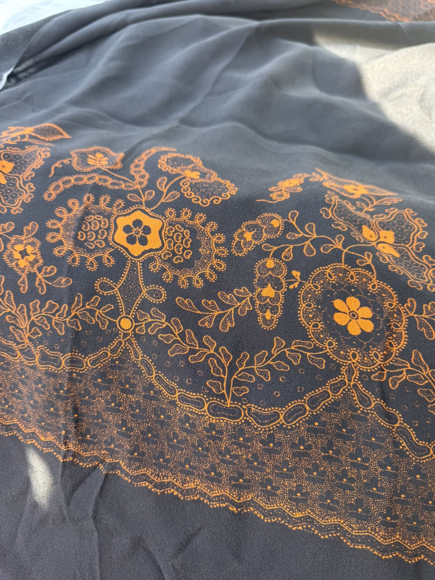 Please see pics for details. This is dead stock silk fabric sheer chiffon. Stored for about 15 years. Black and brown-ish orange. Lots more beautiful vintage, almost vintage and dead stock fabrics available in my other listings. Thank you for checking out my listing! I am consistently posting more as I am growing an online business. Please follow me and check back from time to time. Thank you! Lots more unique treasures in my listings – apparel, accessories, vintage, collectibles, one of a kinds, trade beads, textiles, crafting supplies and more. Bundle and save! #silk #fabric #textile #deadstock #floral #paisley #sewing #seamstress #fashiondesign #artsandcrafts #costume #theater #whimsygoth #hippie #bohemian #coquette #sheer