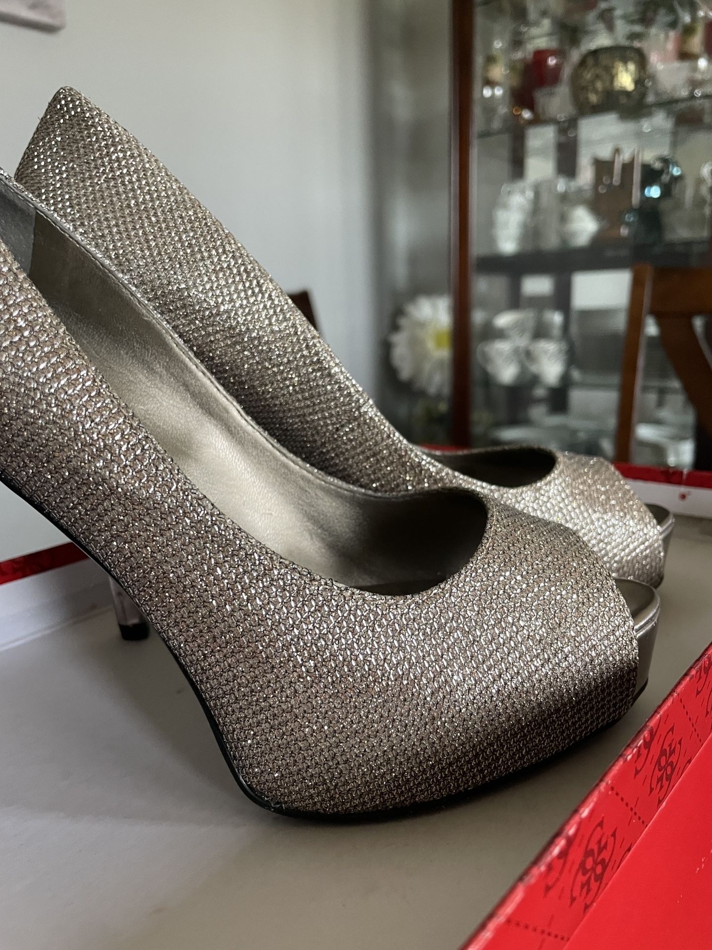 Size 7.5 SUPPER COMFORTABLE TO STAND OR TO DANCE. Special occasion heels.I wore it only for a few hours for my son's wedding inside the venue. In these shoes, your feet won't get tired on your special occasion even, which is very important. It's 4,5” ( including the high of 1” of the platform).I won't be able to wear it again, for any special occasion, due to my knee surgery. Selling for 1/2 of the original price of $79+ taxes. It has a tiny bit of scratch on the inside of the heel. ( see the picture).You will get tons of compliments and will look gorgeous in any outfit style.
