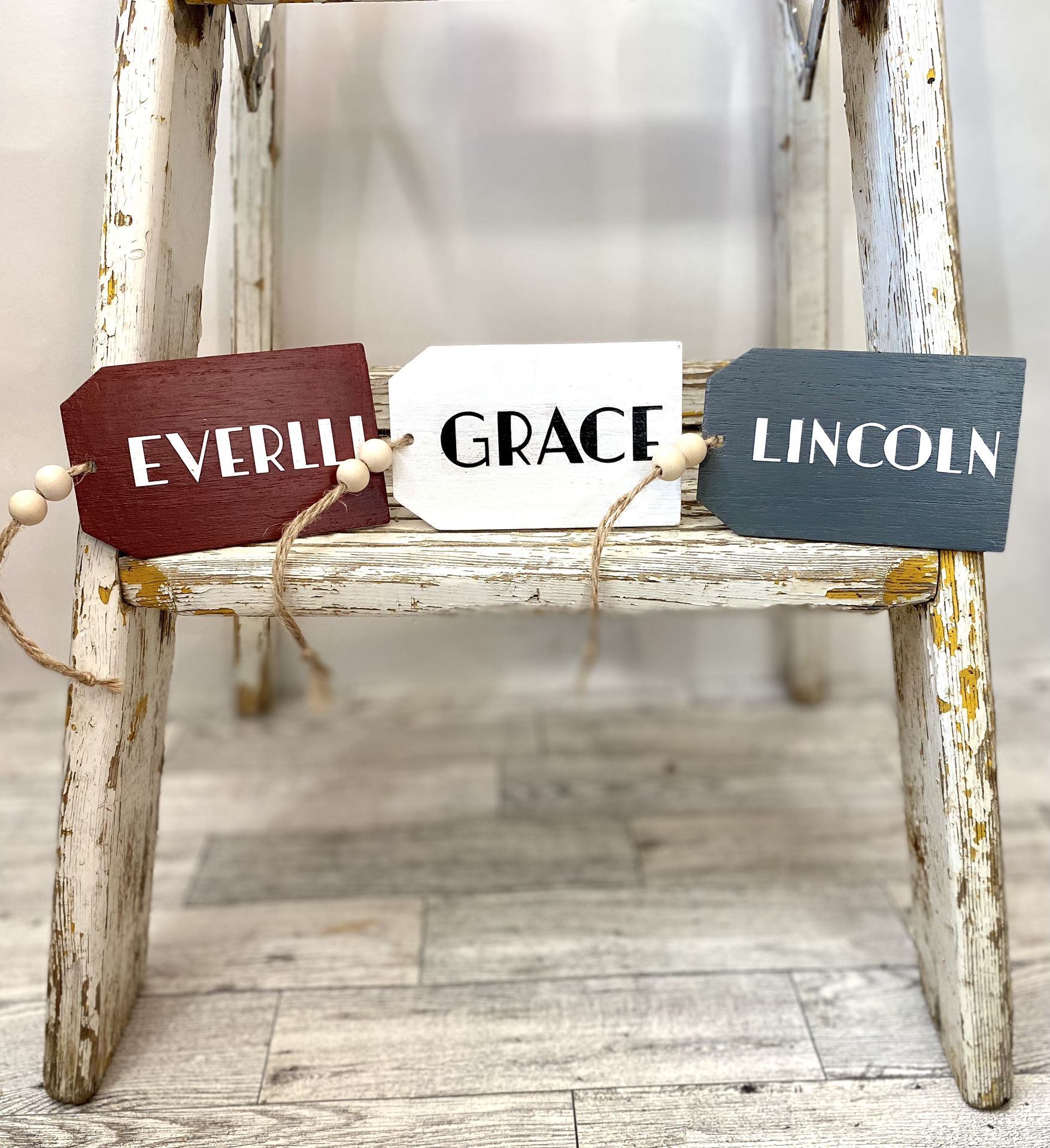 Here they are! Our small wooden tags! Perfect for so many things from Christmas stocking tags, gift tags, ornaments, classroom tags, Easter basket tags, etc! These tags are 100% handmade and hand painted, making them unique and one of a kind. FONT CHOICES 1. Everlli 2. Lincoln 3.Paisley 4. Bailey COLOR CHOICES -Black -Brick Red -Gray -White -White Wash -Natural SIZE 2.5 inchs x 4 inches Names are 3 inches 2 12mm Beads *Twine not included in sizing* **Please keep in mind that these tags are 100% hand made and the designs will be the same, however the paint and distressed look with differ slightly from the photos.**