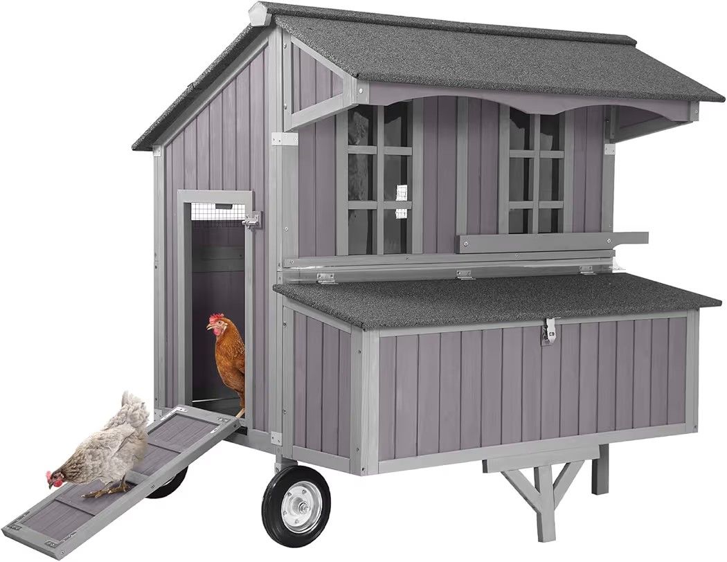 Brand new in box Retails for $400 + tax Cash only pickup in san pedro Aivituvin Chicken Coop Mobile Outdoor Hen House with Large Wheels Durable Wooden Poultry Cage with 3 Nesting Box for 2-6 Chickens 51.5’’ (51.57'' × 41.02'' × 51.18'') BrandAivituvin Model NameChicken Coop Product Dimensions51.57"L x 41.02"W x 51.18"H MaterialFir Specific Uses For ProductOutdoor Special FeatureDurable Effortless Mobility: Features 8.1" heavy-duty metal wheels and metal-reinforced legs for smooth movement across any terrain, making relocation simple and stress-free. Unmatched Durability: Reinforced with iron edges and 26+ structural support points, this coop is built to withstand years of outdoor use while keeping your flock secure. Comfortable Zone: Includes a 3-section nesting box and 3 roosting bars, creating a healthy and cozy environment for your chickens to thrive. Easy Cleaning: Designed with a large sliding tray and 3 openable doors for hassle-free cleaning and convenient access for feeding and maintenance. Spacious & Weatherproof: Offers 11.5 ft² of inner space, ideal for 2-6 chickens or small pets. Made with fir wood and an asphalt roof for all-weather protection.