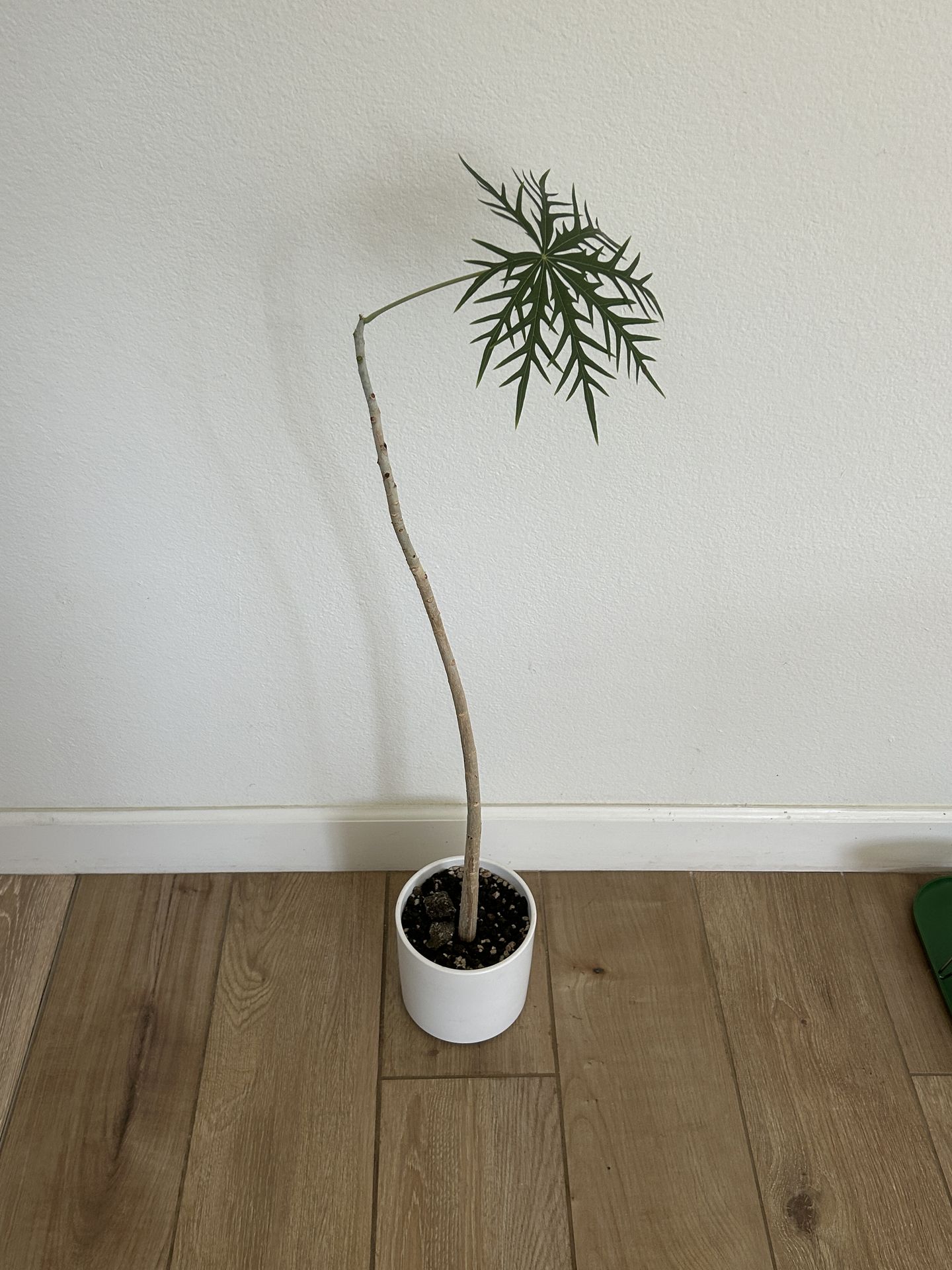 28” high 6” pot diameter Got rid of the dying leaves got new growth coming. My cats like to chew on the leaves and then get diarrhea smh can’t have this around.