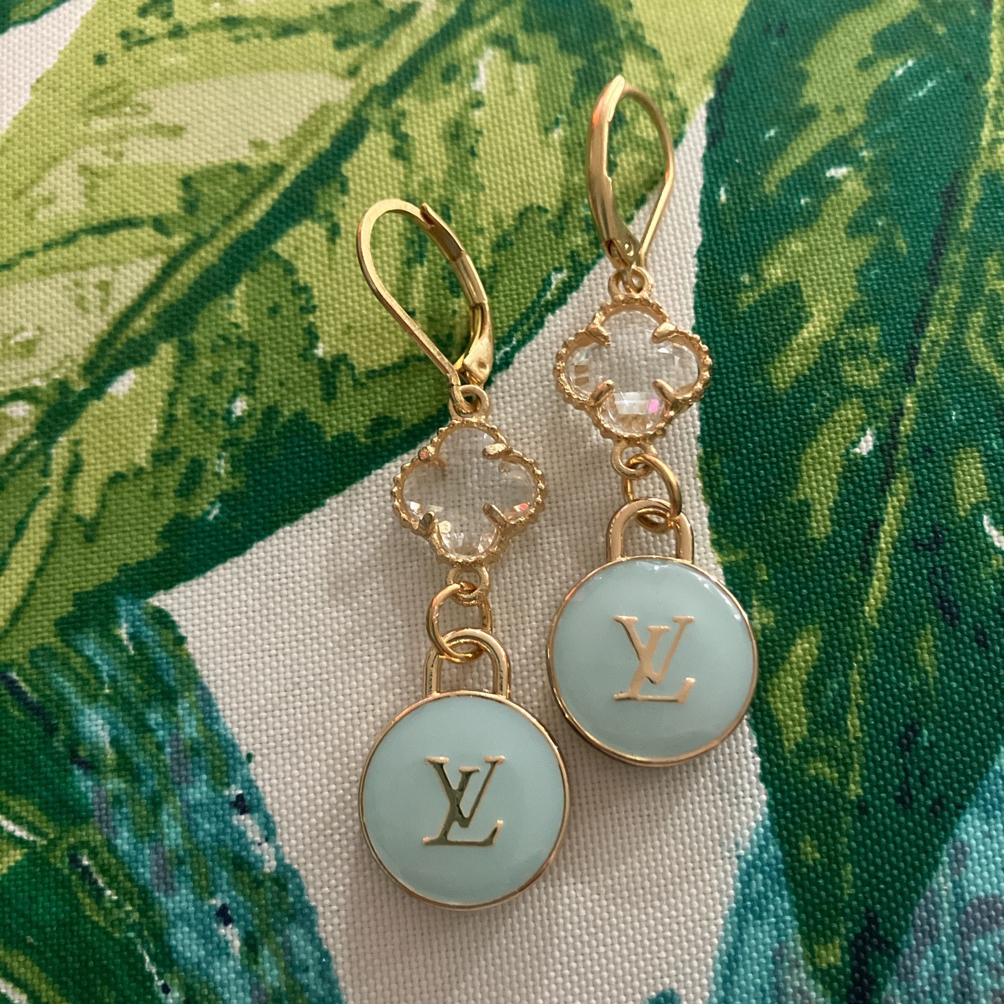 Pretty double-sided light teal charm earrings with gemstone toppers.