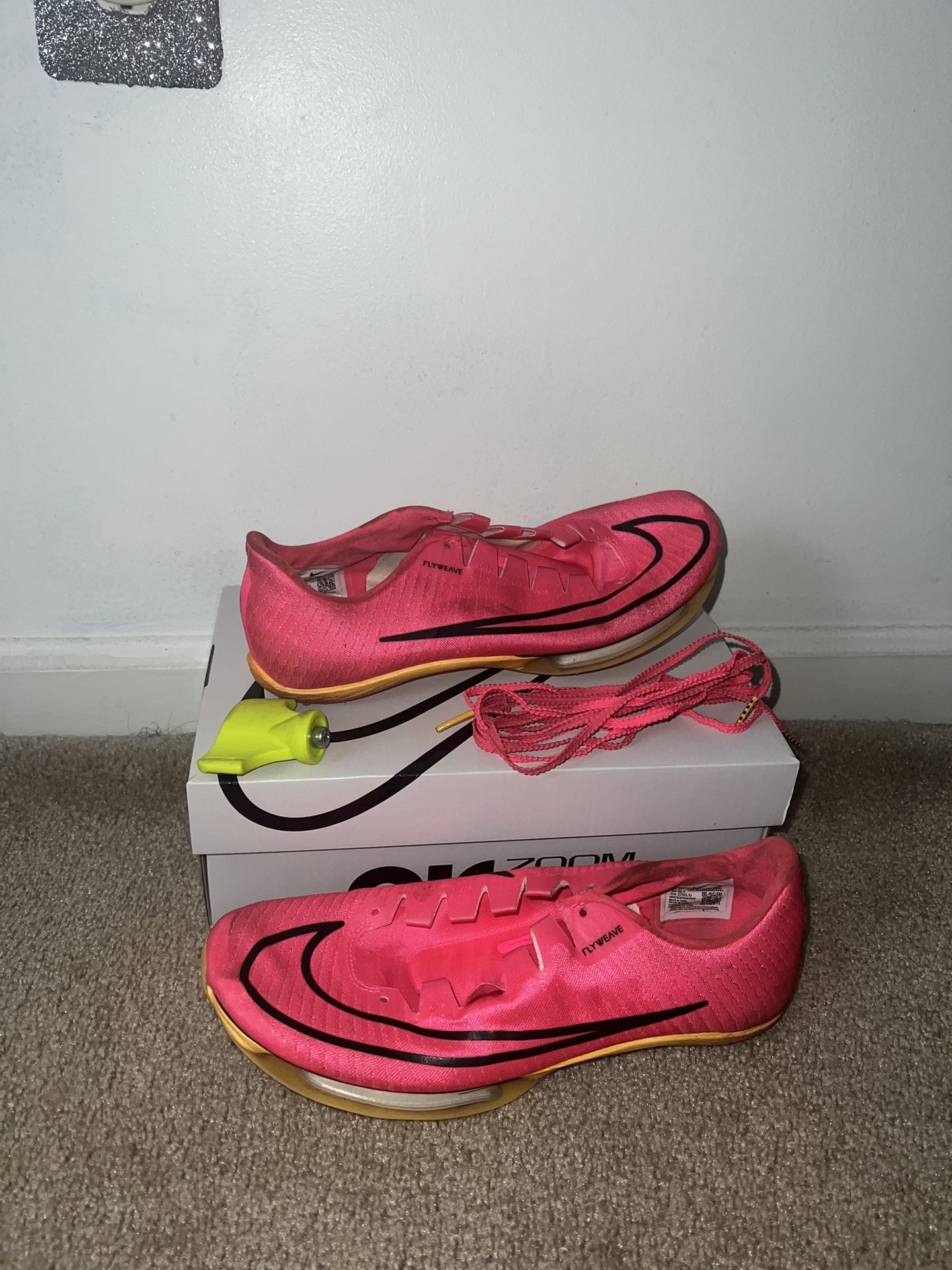 Hyper pink/black-laser orange Men’s 9 Women’s 10.5 Laces, bag, and spike screw included (spikes still durable at bottom but new spike attachments recommended (not included))