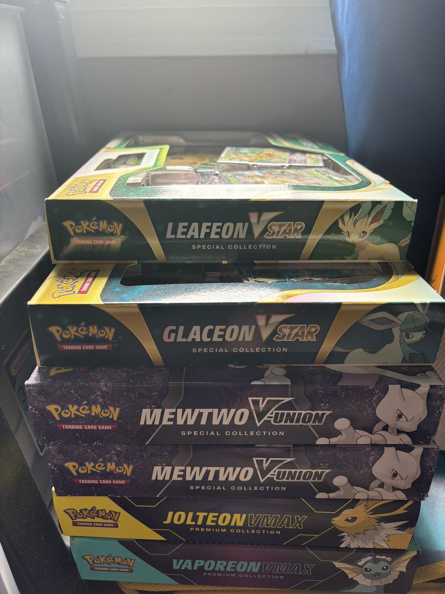 Jolteon Set $125 Vaporeon Set $125 Mewtwo Set $50 each (retail) Glaceon Set $30 (retail no tax) Leafeon Set $30 (retail no tax)