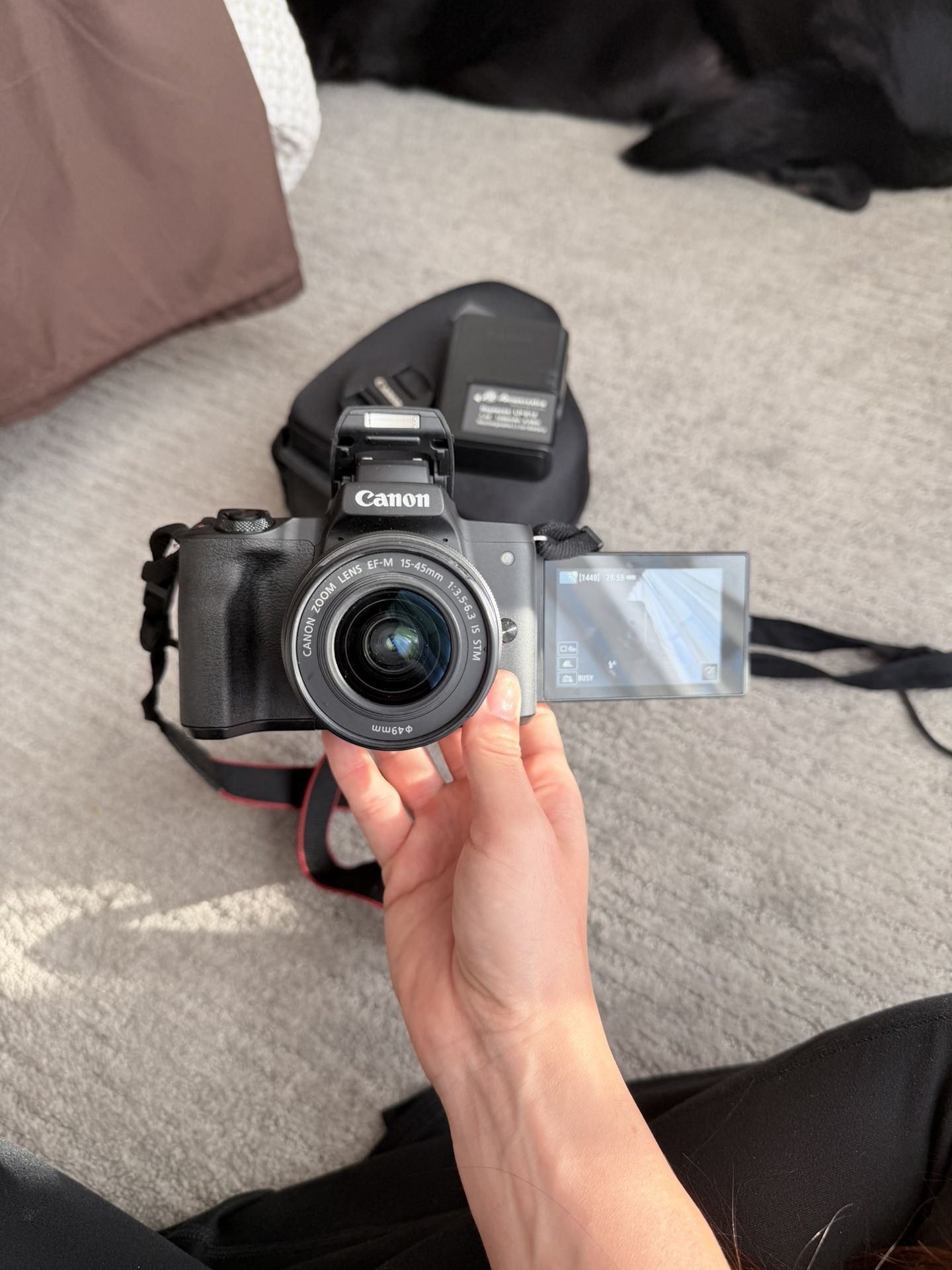 Canon M50 with hard case, 2 batteries, charger, strap, lens’s, and lens cap. This camera takes INCREDIBLE photos so let me know if you need examples. connects to your phone instantly. Unfortunately I just don’t use it enough so trying to get some money for it! Works perfectly and never had any issues. Best for vlogging!