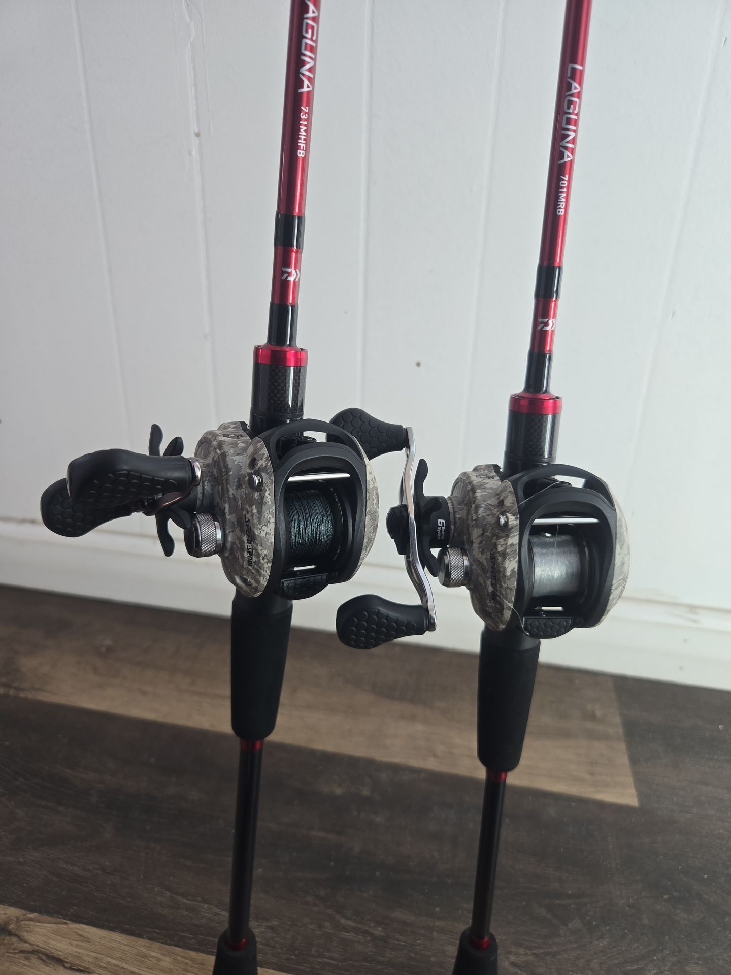 Lews American hero baitcaster reels. Both spooled. Daiwa rods 7'3MH and 7'0M Never used. Obo