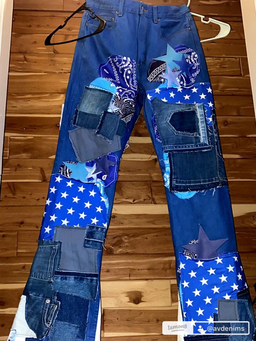 I dyed the jeans blue added blue star fabric and made the leather stars myself size 32x32