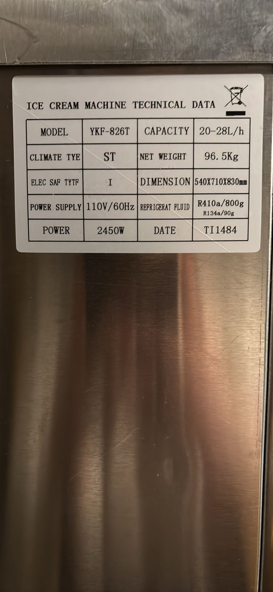 Commercial soft serve ice cream machine in good working condition. Great for restaurants, food trucks, snack stands, or small businesses. Details: • Model: YKF-826T • Production Capacity: 20–28 liters per hour • Power: 110V / 60Hz (standard outlet) • Power Consumption: 2450W • Refrigerant: R410a • Net Weight: 96.5 kg (~212 lbs) • Dimensions: 540 × 710 × 830 mm • Stainless steel commercial unit Produces high-volume soft serve and built for commercial use. Comes with table. $1500 OBO Can deliver