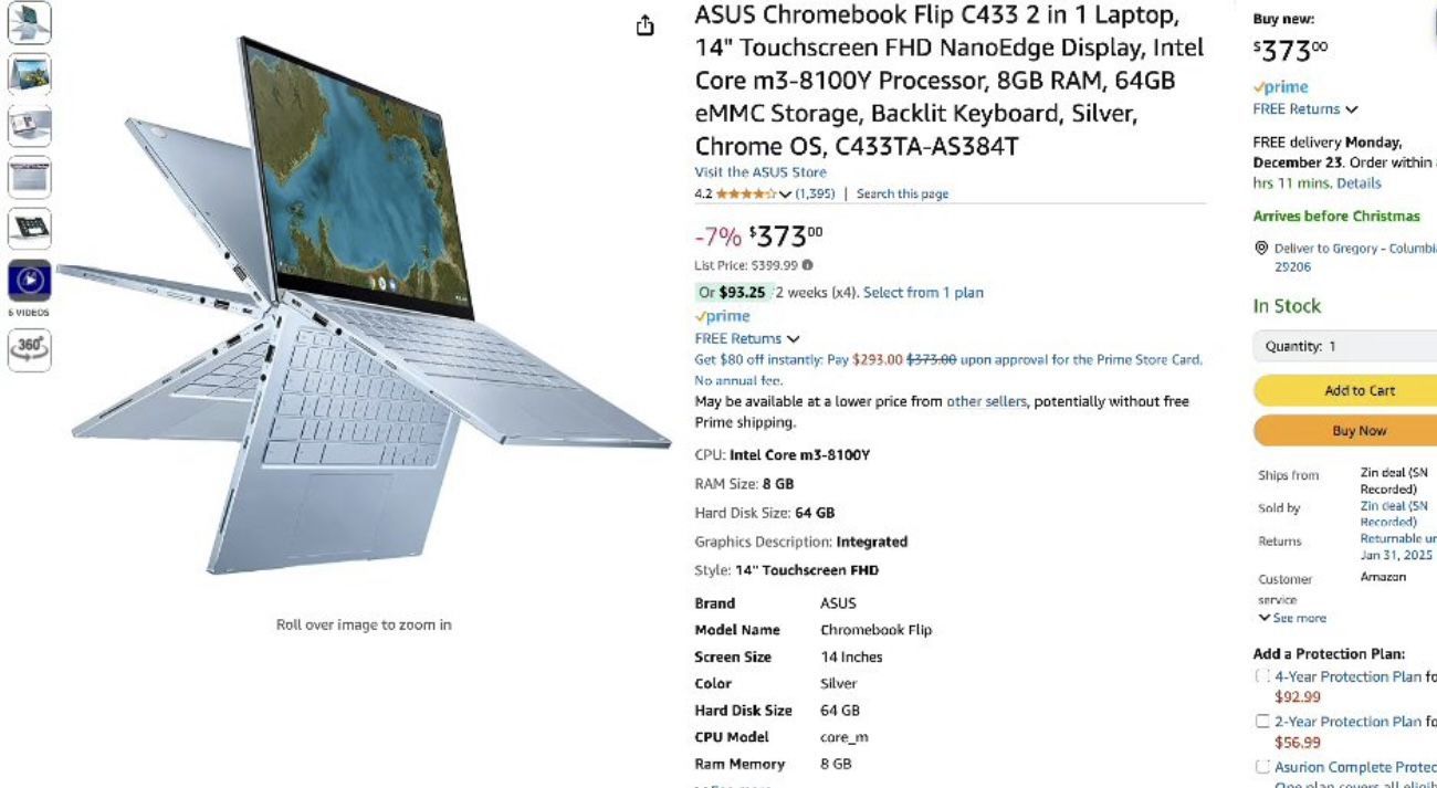 I am selling my ASUS Chromebook Flip C433 2 in 1 Laptop, 14" Touchscreen FHD NanoEdge Display, Intel Core m3-8100Y Processor, 8GB RAM, 64GB eMMC Storage, Backlit Keyboard, Silver, Chrome OS, C433TA-AS384T. Great Condition, no cracks, scratches, or dents, I still have factory box with all peppers and components. $200 obo. Link provided below will direct you to the amazon cart where I purchased. https://offerup.com/redirect/?o=aHR0cHM6Ly9hLmNvL2QvODhnazlEeA==
