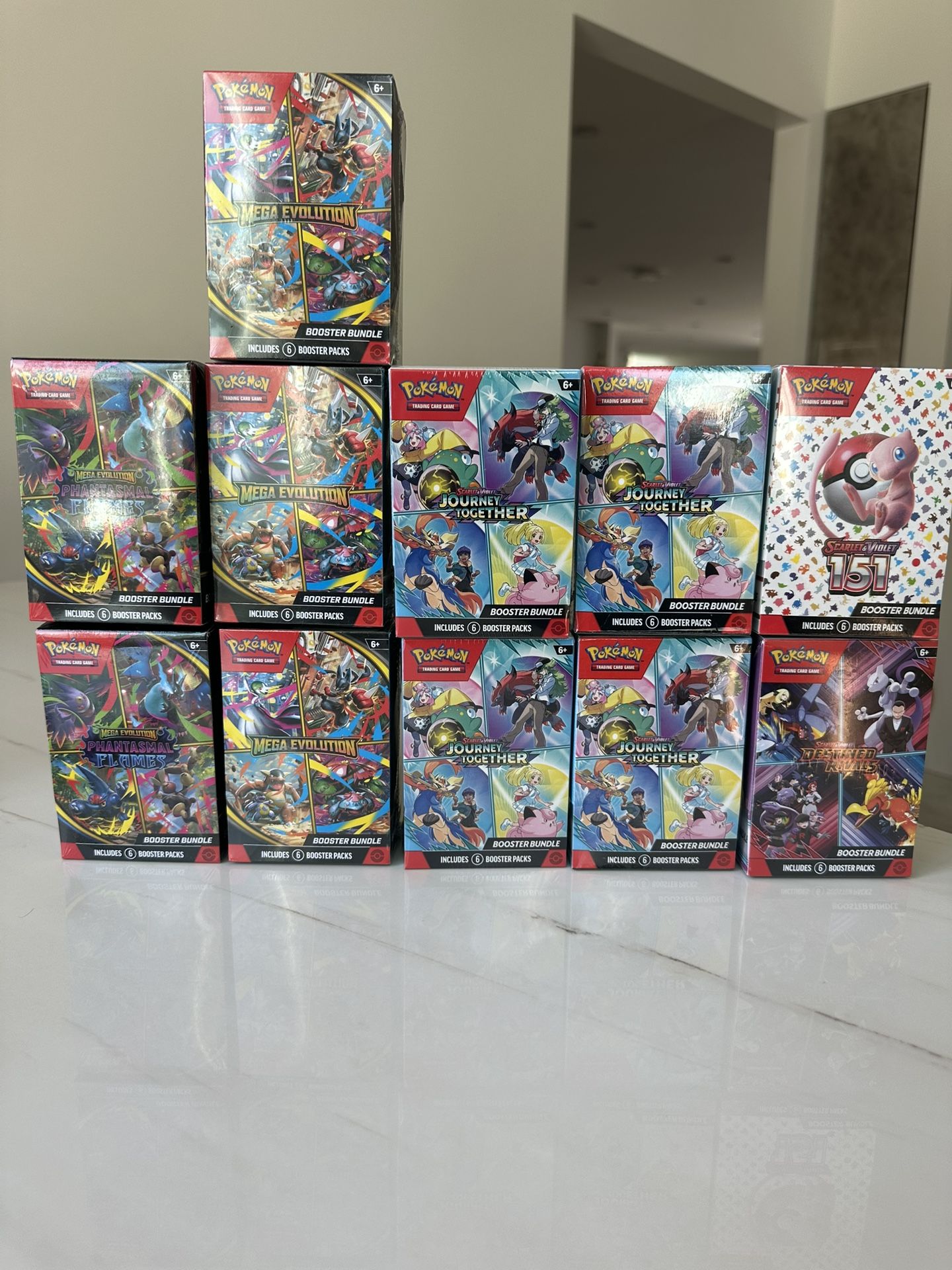 6 booster bundles left! $50 for 1, $45 each for 2 or more! 3 Journey Together, 2 Mega Evolution, 1 Phantasmal Flames.