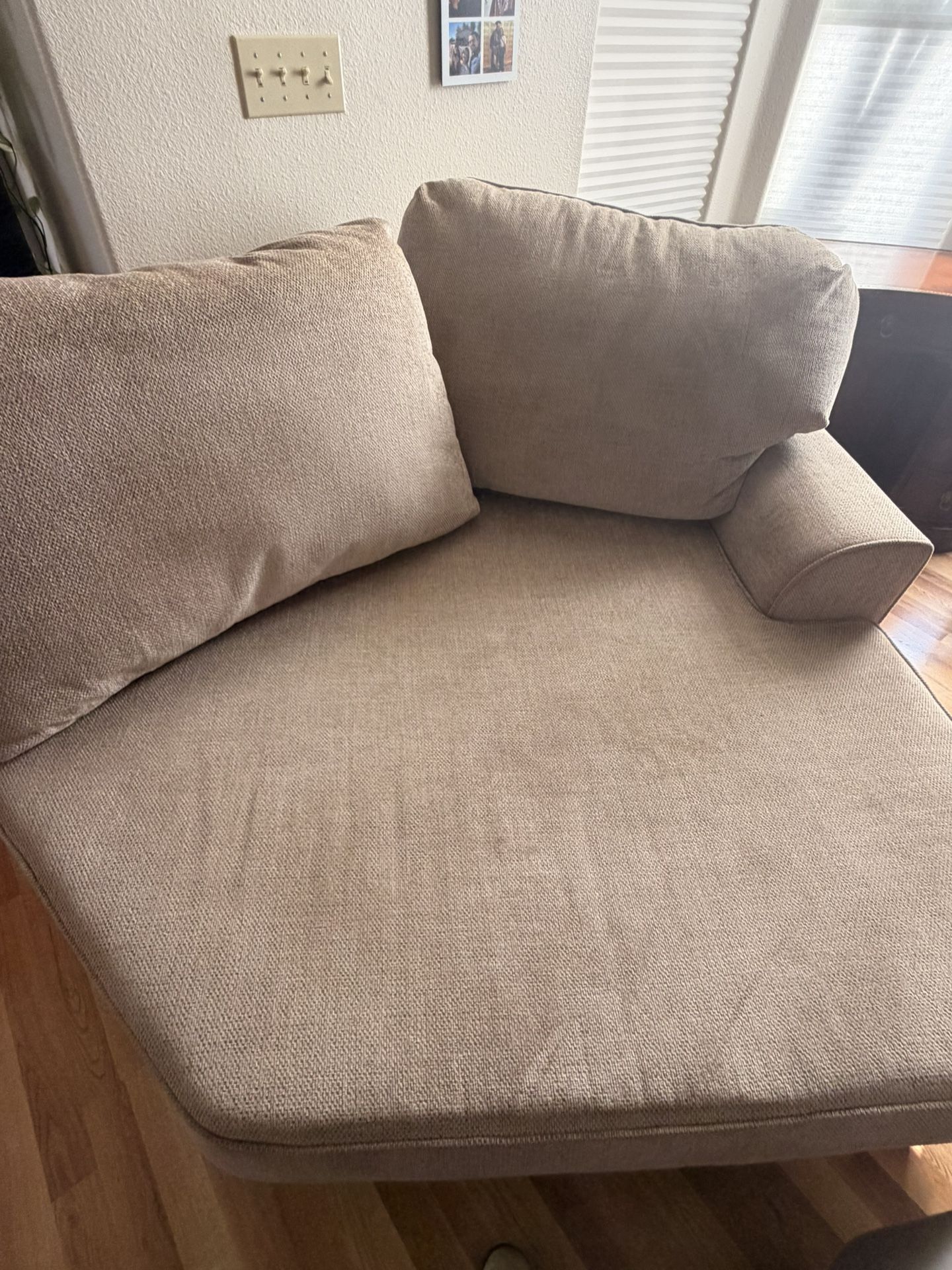 Large Sofa Corner piece only beige lounger with Two large cushions gently used. 5ft across and 5 ft front to back -3ft tall. Great for corner reading nook.