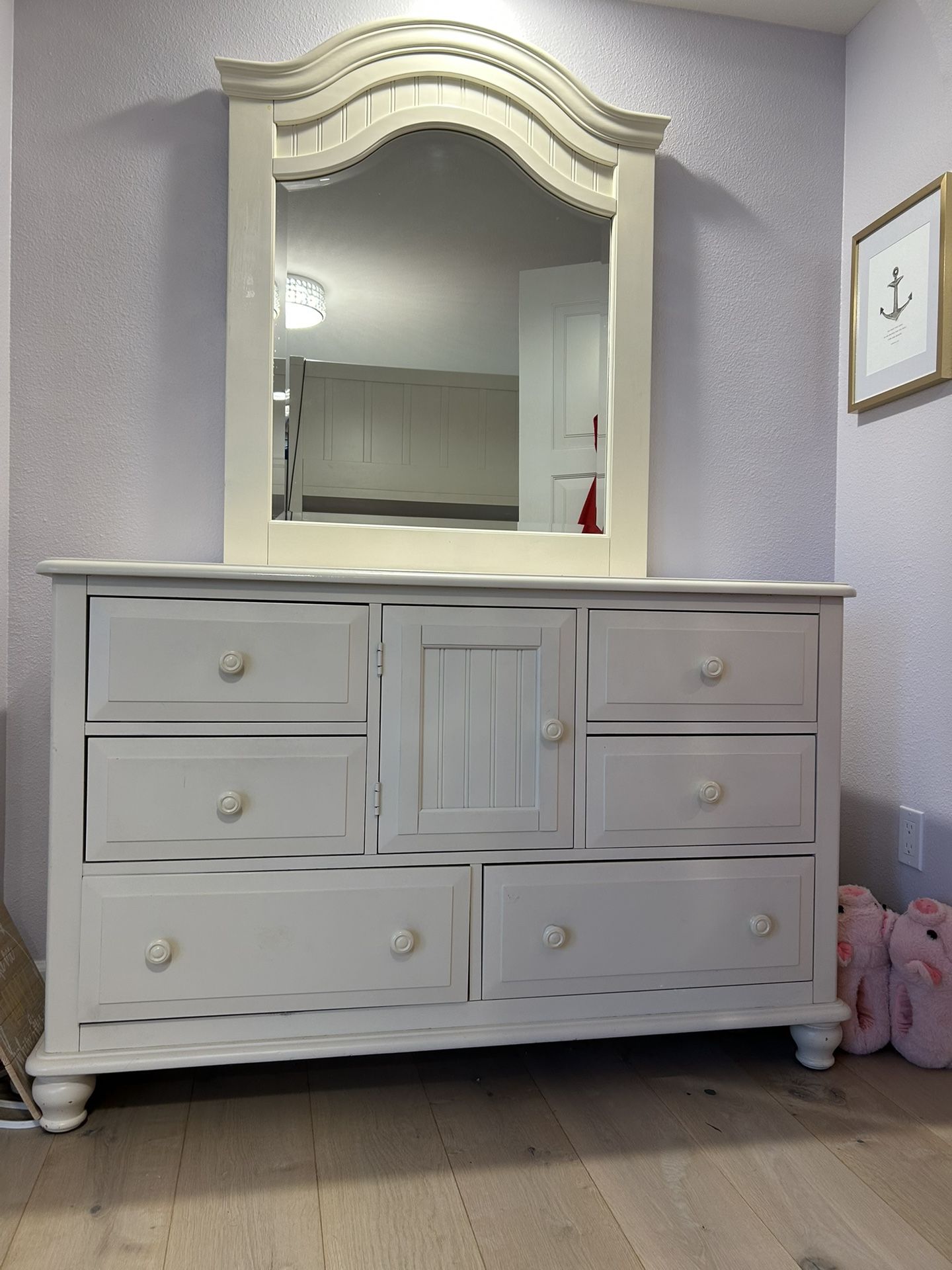 Beautiful white wood dresser with mirror. This is in great condition with only a need to fix the wood rail on the bottom drawer. A couple of new screws should fix it easily. This was in our daughter’s room.