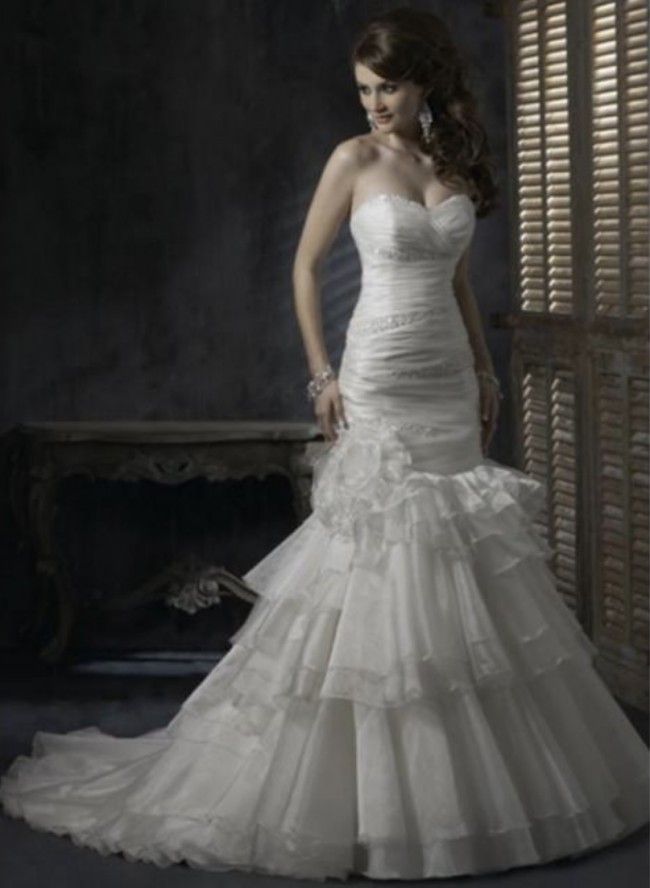 Brand new, never worn Maggie Sottero Destiny dress in white. This figure-flattering dress is a stunning, floor length gown, strapless with a sweetheart neckline. The bodice is form-fitted, creating an hourglass figure, and features gorgeous beading. The dress is a trumpet or mermaid shape. It flares out right above the knee, into a beautiful tiered tulle skirt, cascading all the way to the ground and bringing the full flowing "wow" factor. Please note this dress is pure white, not ivory or off-white This dress comes with the Maggie Sottero Certificate of Authenticity It is an original Maggie Sottero Couture Bridal Gown This dress has no alterations or modifications The dress also includes an extra small bag of the same beading shown on the bodice (if needed for any alterations/touch ups), as well as an additional white lace for the corset Never worn, brand new and in perfect condition Label size 4, though I am typically a size 2 in dresses My height is 5'6" without heels and 5'11" with 5" heels