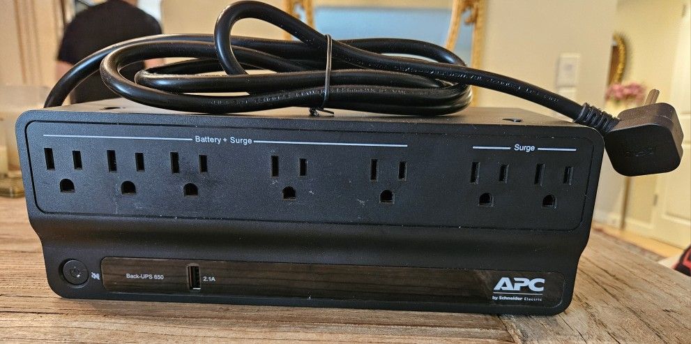 APC 650VA UPS (model BVN650M1) in good working condition. Provides battery backup and surge protection for computer, router, in home office setup. -650VA/360W capacity -Multiple outlets (battery backup + surge protection) -USB charging port -Compact and reliable Battery holds charge and unit functions properly. Great for protecting equipment from outages and voltage fluctuations. Pickup in Sherman Oaks