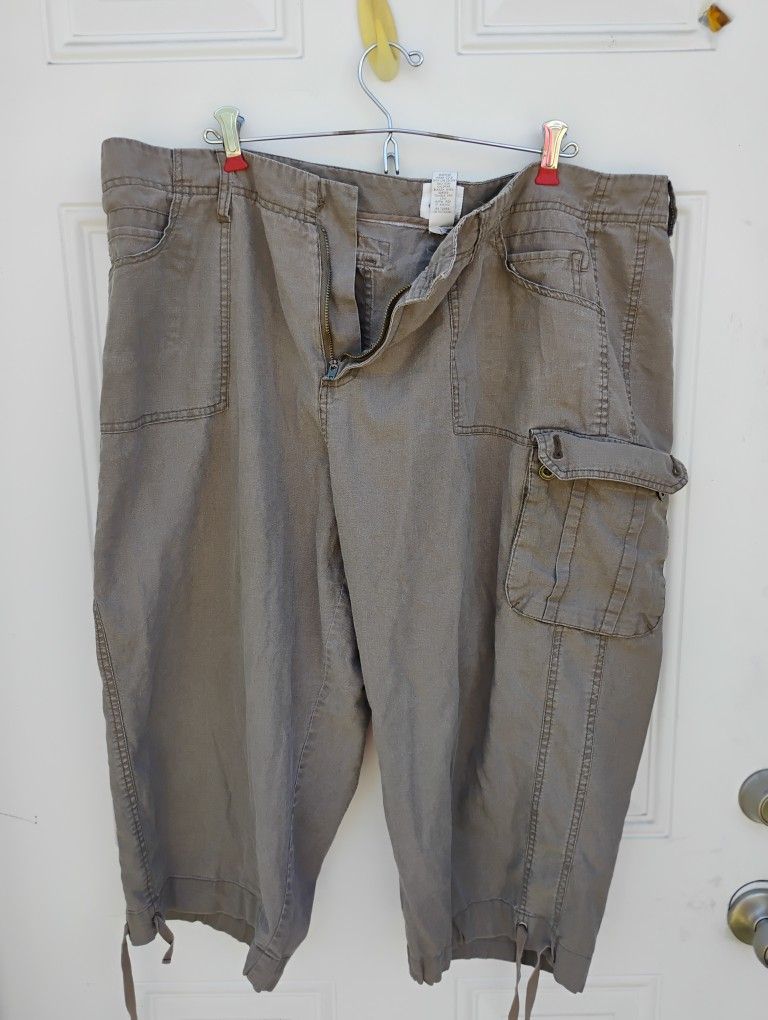 These gray cargo pants offer a comfortable fit with a straight-leg design, perfect for everyday wear. Made from durable materials, they provide both style and functionality. Ideal for casual outings, these pants are a versatile addition to any wardrobe. These are Fashion Bug olive green cargo pants with the lace leg tie in the bottom of the pants the linen is 55% linen and then 45% cotton. The only flaw is it needs a button
