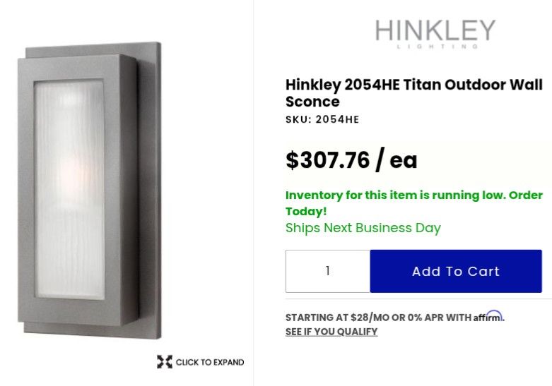 I recently remodeled the exterior of my home. All light fixtures are working and no issues. Mounting bracket / screws included. Original retail $1,200+ Large fixtures: $100 a piece (qty 2) Small fixtures $75 a piece (qty 3) Will sell everything for $300 I live by Washington and Oak Bluff in Naperville. Thanks, Paul 630 x 202 __ 8925 Hinkley 2054HE Titan Outdoor Wall Scone Back Plate (inches): 8.5 x 17.5 Hinkley Outdoor Titan Small Wall Mount Back Plate(inches): 6.75 x 14 STYLE - Finish: Hematite - Collection: Titan - Glass: Organic Ribbed Etched - Material: Aluminum - Works with dimmable bulbs - Max Wattage: 100.00