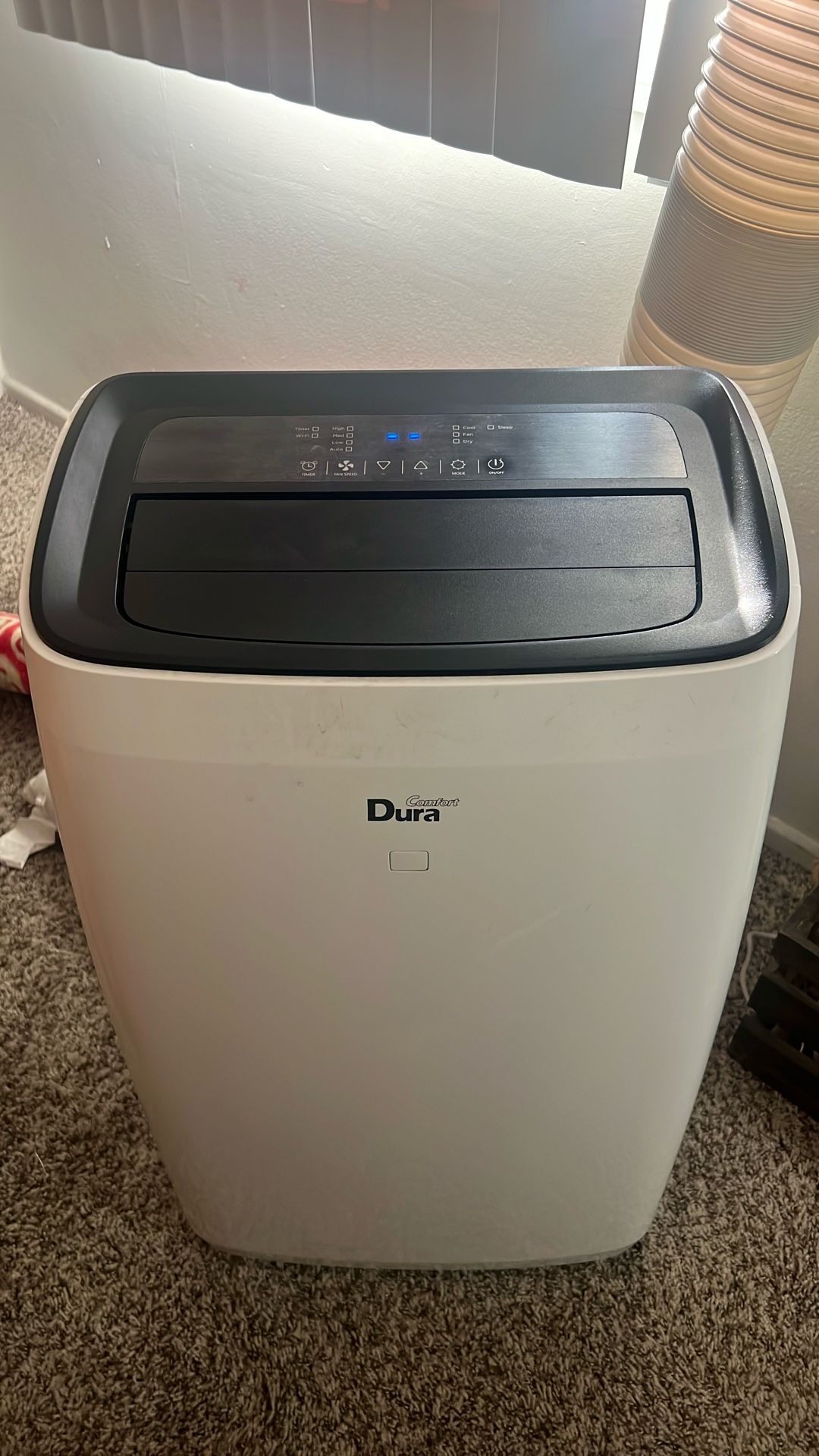Window attachment. Great for cooling living room. 3 years old. High, medium, low and auto settings. Cool, fan and dry settings. Sleep mode and timer.