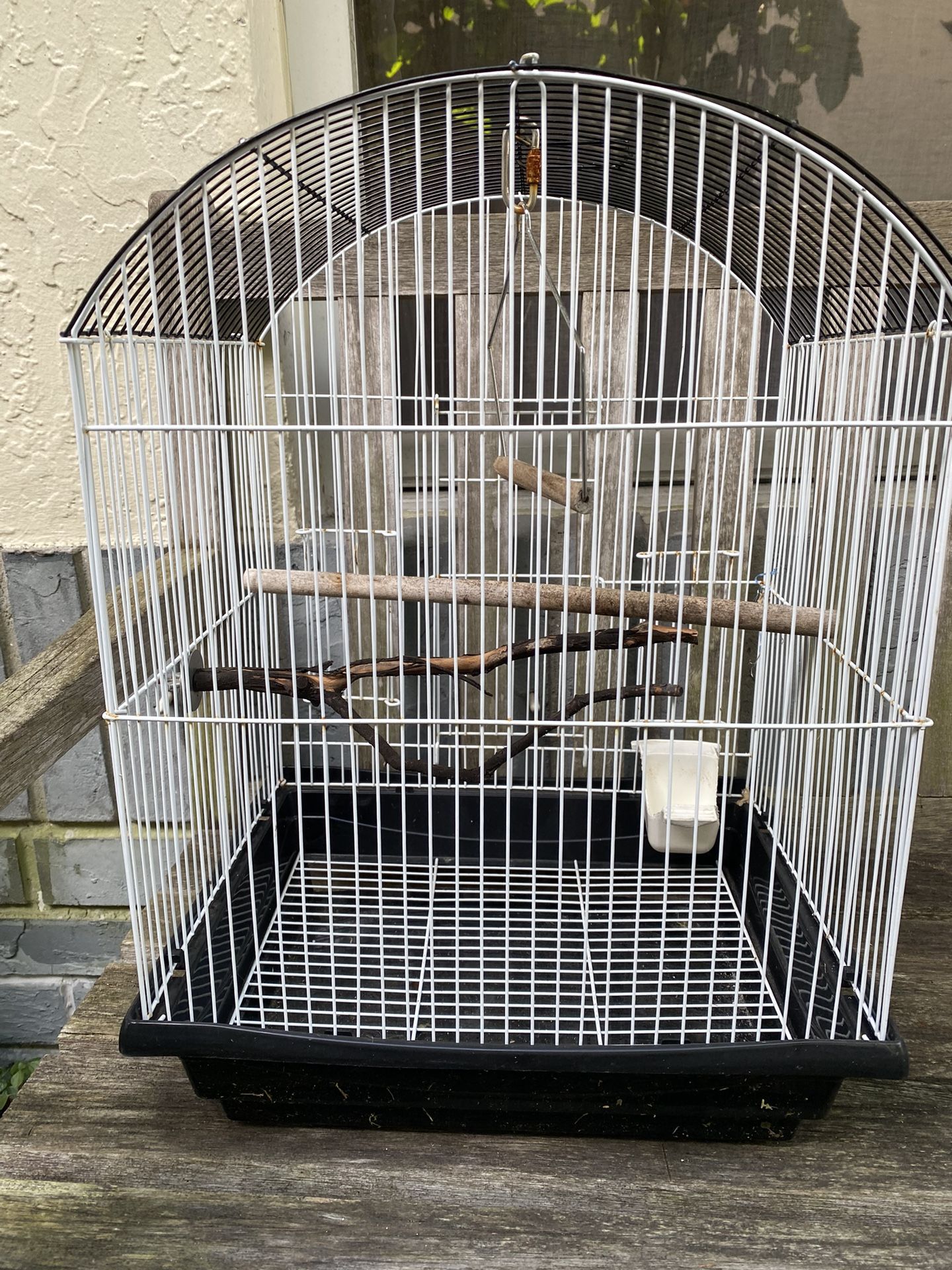 Metal bird cage with hanging swing and wood plus feeder, in very good/clean condition. Measurements in pics