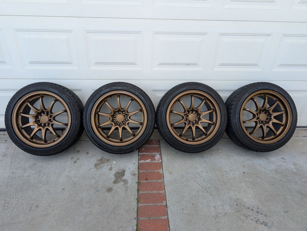4x 17x9 Rota DPT/Fighter, +35 Offset, 5x114.3 and 5x100, these are the closest Volk CE28 replicas. Was originally hyperblack, refinished to bronze, inside barrels still black . Finish is not perfect but still in good condition. Nice offset/concavity. -80%+ tread on the 235/45/17 Ohtsu FP7000 (Parent Company is Falken!!!) tires, No uneven wear, patches/damages.