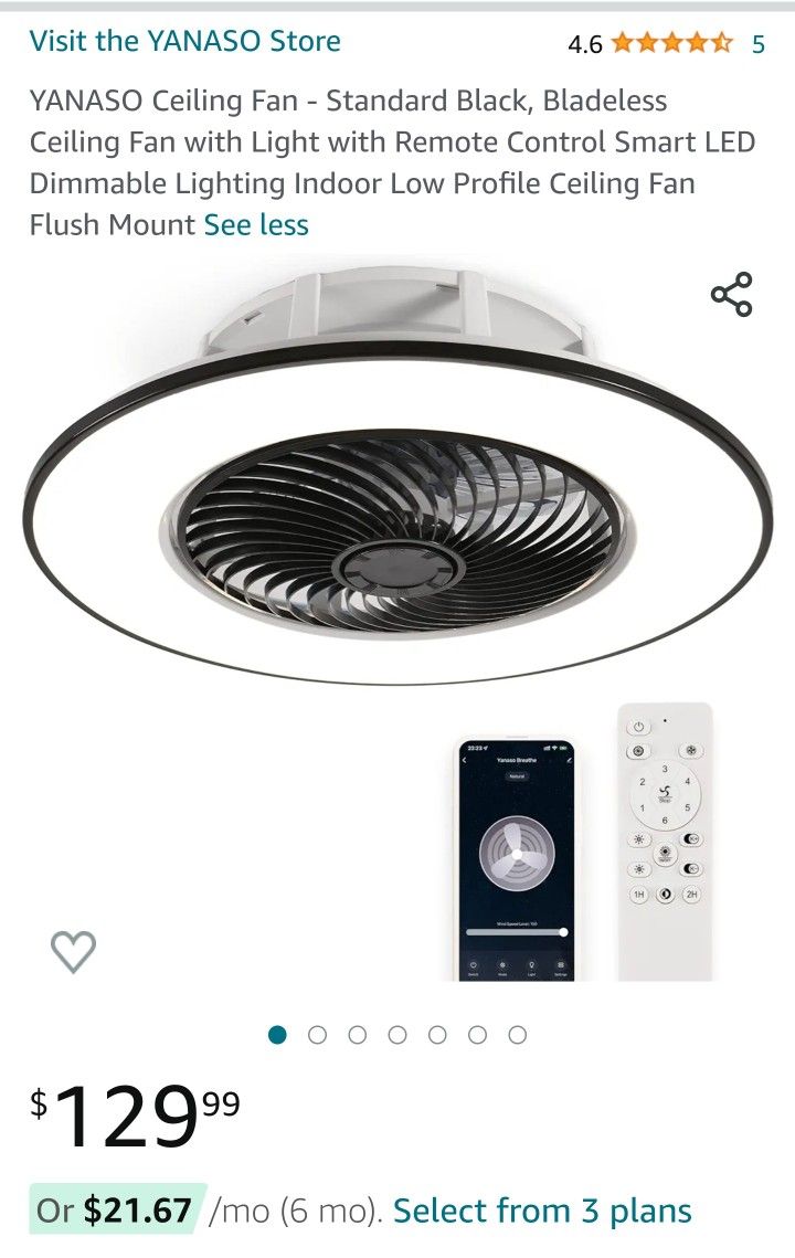 Brand new! Purchased in August 2023 for $130. YANASO Ceiling Fan - Standard Black, Bladeless Ceiling Fan with Light with Remote Control Smart LED Dimmable Lighting Indoor Low Profile Ceiling Fan Flush Mount