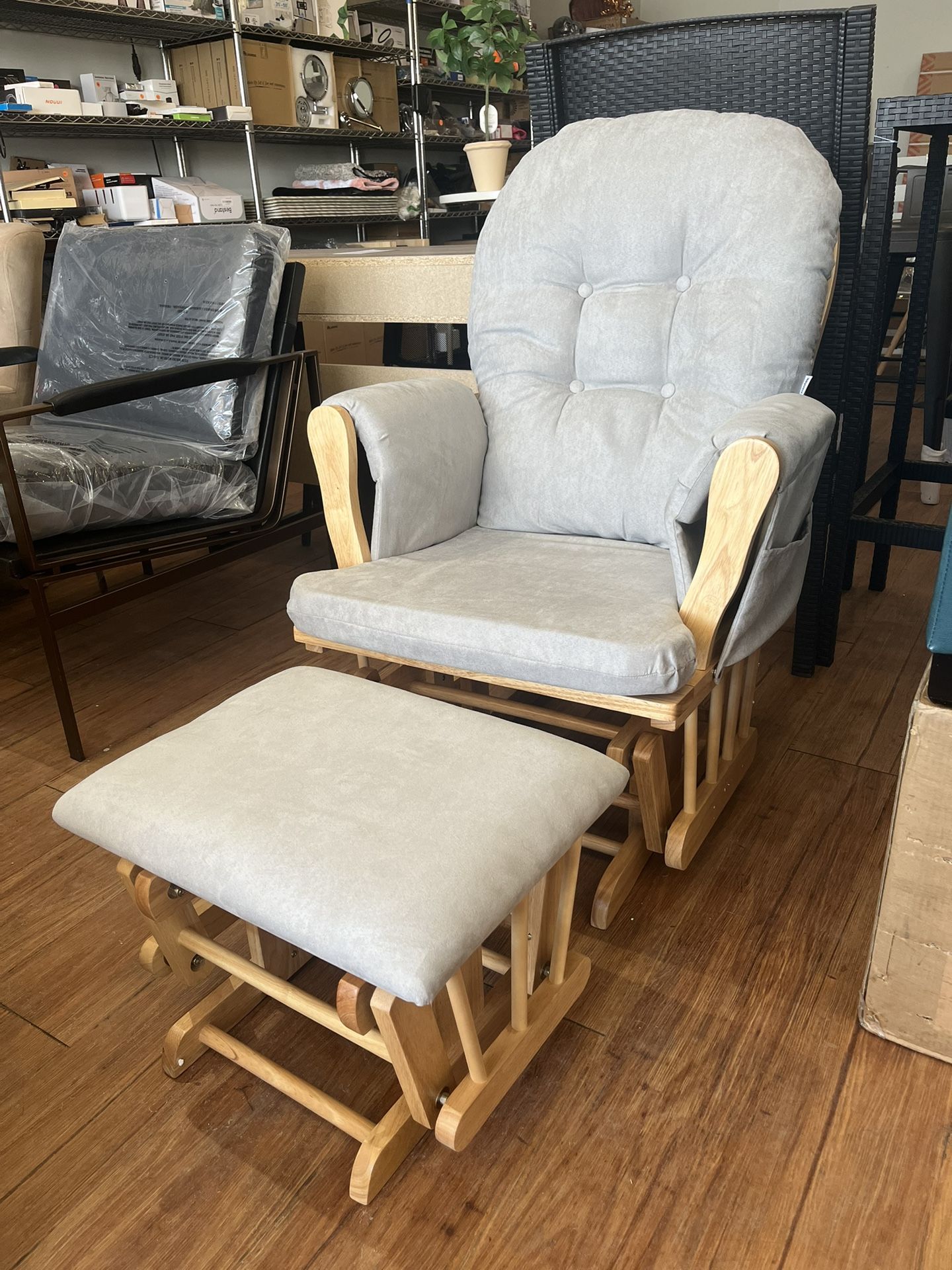 Nursing Rocking Chair Brand New Wooden, Natural Finish w/ Grey Cushion Comes with Foot Rest Located At Treasures Depot Brookfield 9207 Broadway Ave Brookfield Illinois