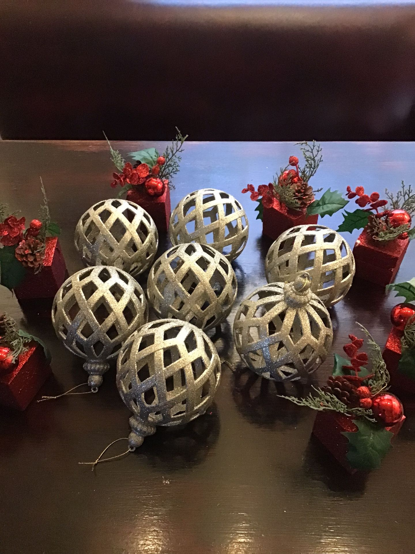Beautiful, silver Christmas tree bulbs, ornaments, large Red and green Christmas decorations boxes with red bulbs For table, decorations for tree decoration All for $8