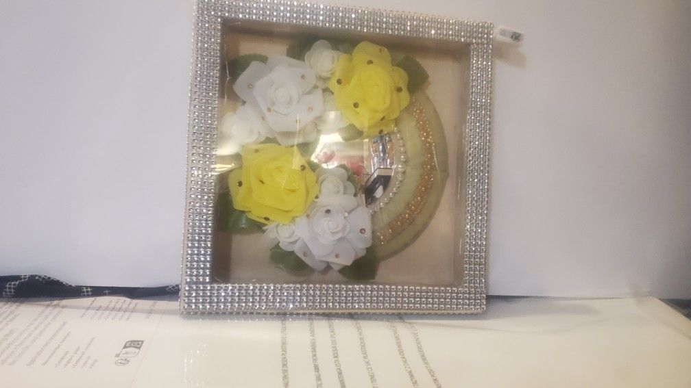 Add a touch of elegance and enchantment to your space with this exquisite handmade shadow box. Each piece is meticulously crafted with attention to detail, creating a stunning display that will captivate anyone who lays eyes on it. The shadow box features built-in LED lights that softly illuminate the contents, creating a mesmerizing glow and highlighting the intricate design. The lights can be easily turned on and off, allowing you to create the perfect ambiance for any occasion. Adorned with sparkling rhinestones, this shadow box adds a touch of glamour and sophistication to any room. The rhinestones catch the light and create a dazzling effect that is sure to impress. The tulle adds a delicate and whimsical element to the design, creating a dreamy atmosphere. The soft fabric gently drapes over the contents of the shadow box, adding texture and depth to the overall composition. To enhance its visual appeal, the shadow box also features a mirror at the back. The mirror reflects and amplifies the beauty of the contents, creating a sense of depth and dimension that will leave you in awe. Whether you're looking to decorate your living room, bedroom, or office, this handmade shadow box is the perfect choice. It also makes a thoughtful and unique gift for weddings, anniversaries, birthdays, or any special occasion. [Product Features] - Handmade with love and attention to detail - Built-in LED lights for a mesmerizing glow - Sparkling rhinestones for added glamour - Delicate tulle for a whimsical touch - Mirror at the back for enhanced visual appeal - Perfect for home decor or gifting