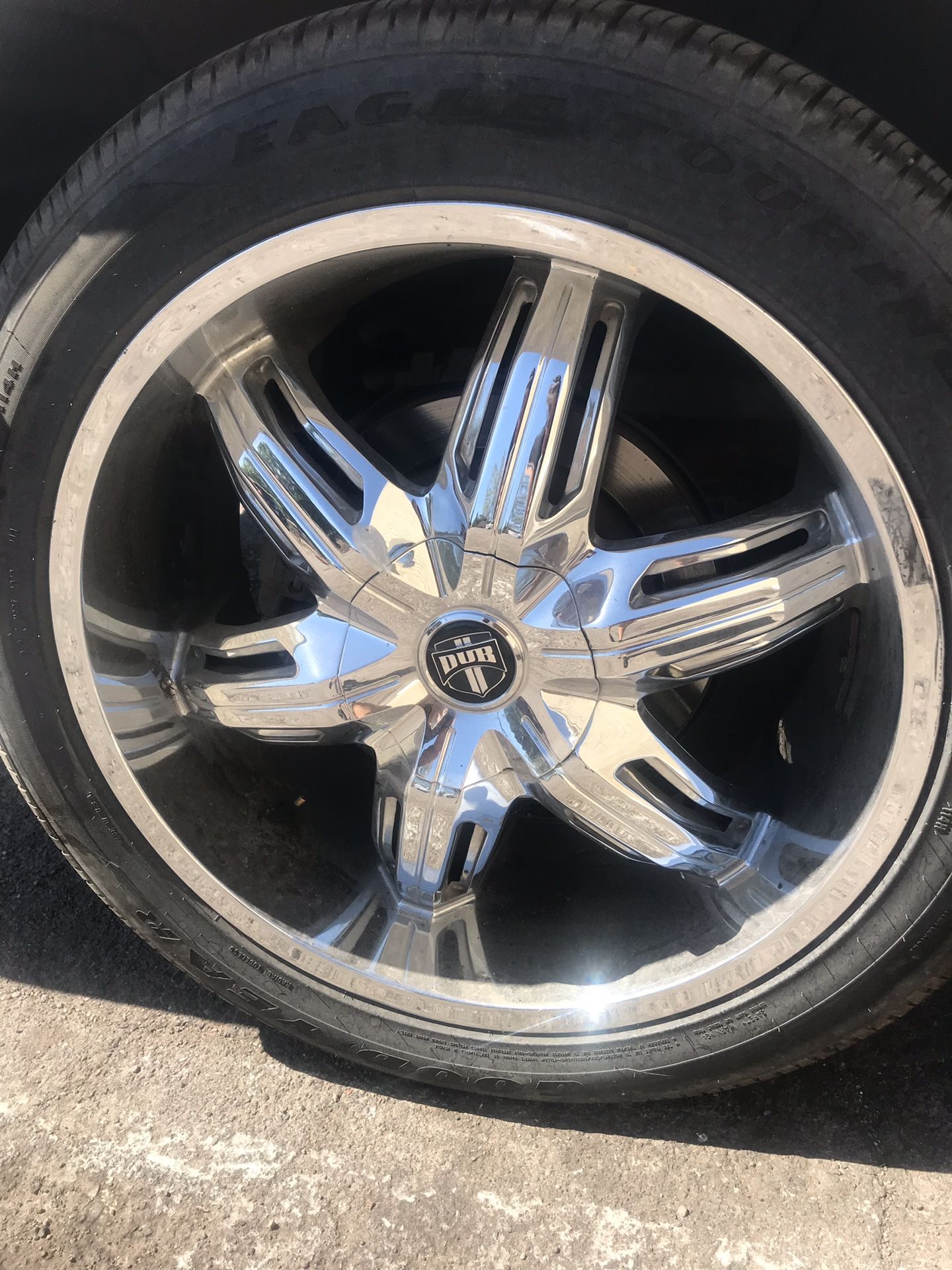 4 dub rims and tires for sale. Also includes a new spare tire and rim. 3 tires are almost worn and one is popped but I’m selling the rims. In need of rent money ASAP . They all have caps and are in fair condition. If u like to see them then come to 27 ave and northern. Was taken off a Ford Expedition. It’s a 6 lug or 5. I may have the lugs as well. Ford. Chevy. Dodge. Truck. Tires. Spare tire . Rims . Dubs. 22”