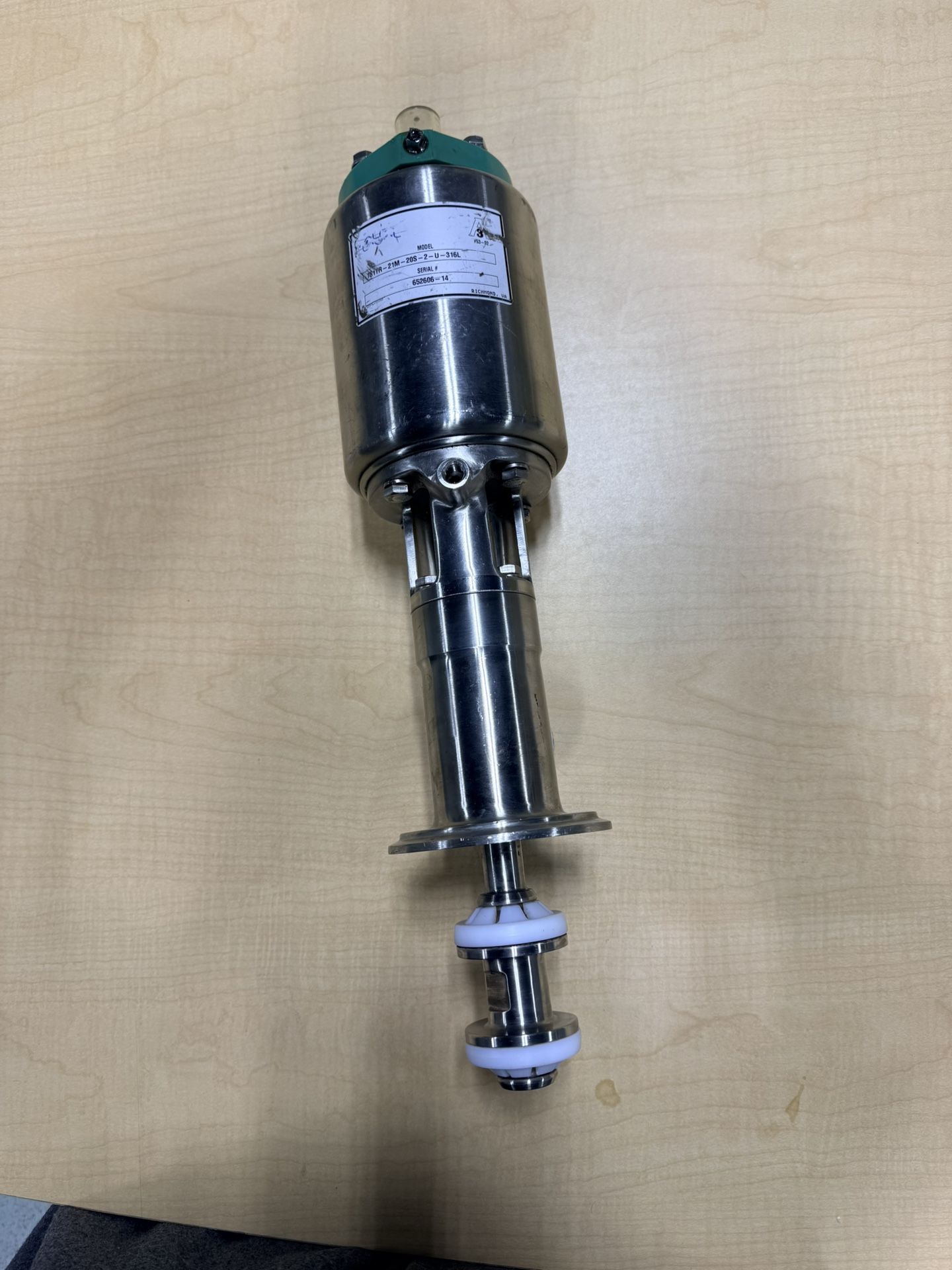 Manufacturer: Alfa Laval / Tri-Clover Model: 761TR-21M-20S-2-U-316L Serial #: 652606-14 Used Tri-Clover Series 761 Air-Actuated Seat Valve. This is a high-grade sanitary valve designed for food, dairy, or pharmaceutical processing. Specifications: * Body Material: 316L Stainless Steel * Size: 2-inch Tri-Clamp connections * Type: Tangential Divert Valve (TR Series) * Condition: Used. Internal seals have not been tested, but the body and stem are in good cosmetic condition. * Actuator: Pneumatic with visual position indicator. Note: Sold as-is. Professional inspection/re-seal is recommended before use in a production environment.