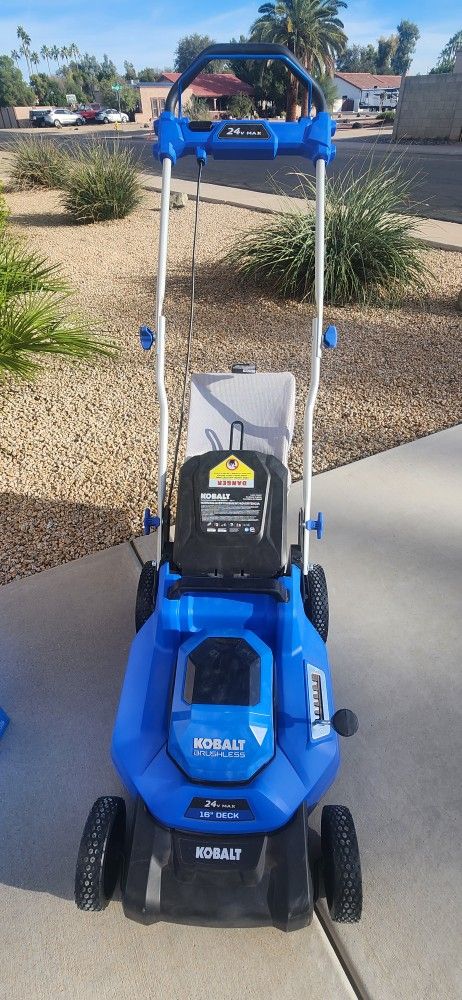 KOBALT 16" mower, catch bag, charger with 2 batteries. Less than 1 year old ... used 4 times.
