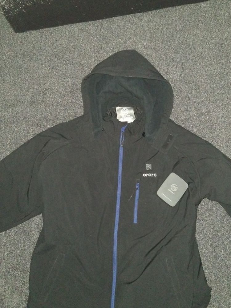 Ororo heated jacket is waterproof, windproof and heated. Comes w battery small in small size long battery life. I bought this few months ago and I haven't charged it. 7.4V 4400 mAh 32.56Wh Input DC 8.4/1.0A Output DC 7.4/2.2A Super warm. Push chest button and hold to turn on heat. Red is hot, Yellow is warm, Blue is least warm. Hold down till light goes out for turn off. Simple and convenient. ***I wear large and extra large xl and this jacket fits me comfortable not too big. They are more fitting than normal 2xl I would consider this an XL at most in my opinion for anyone wearing larger than xl. I am 6'1 220 lbs and it fits me perfect and I wear L and XL