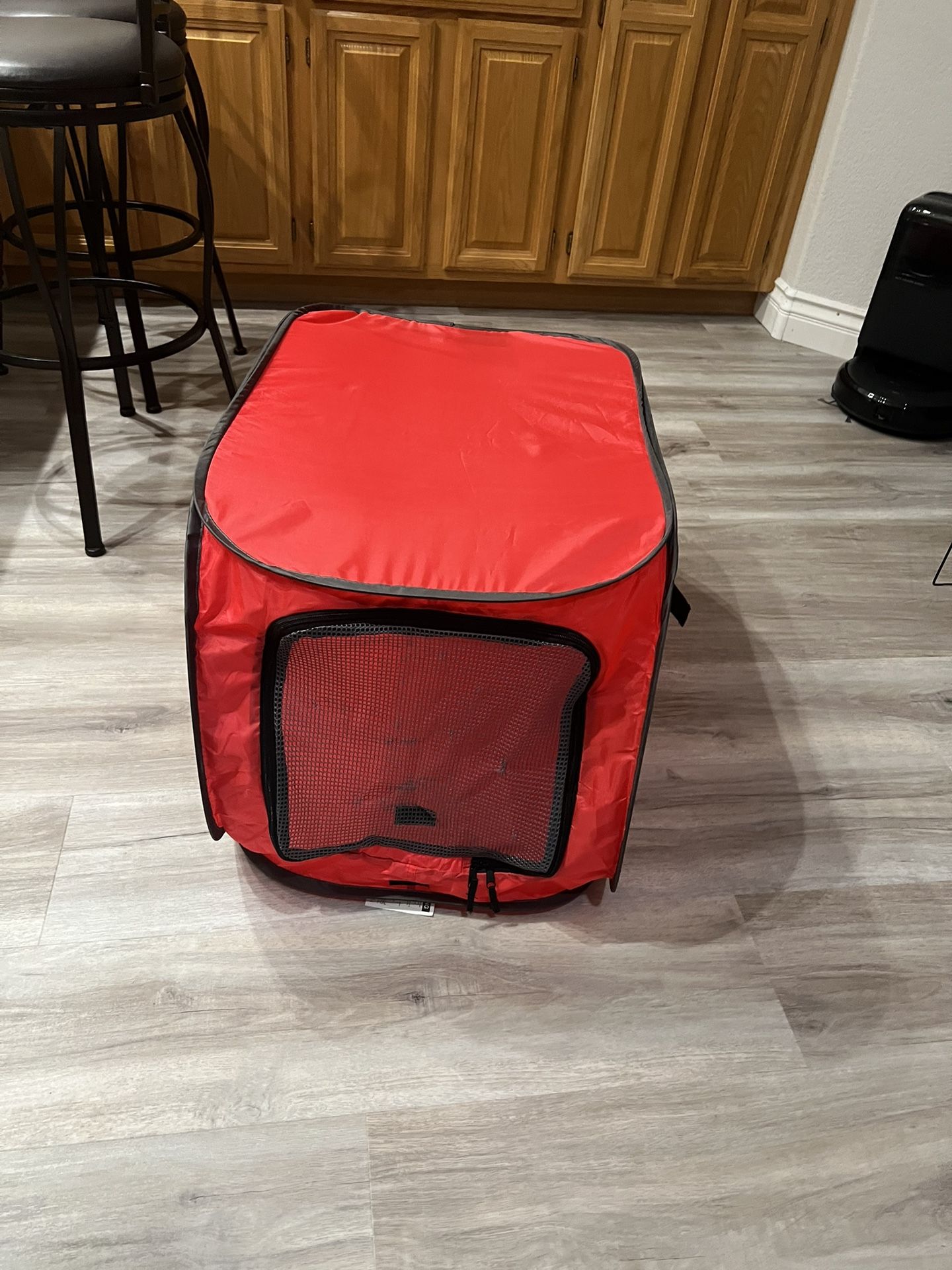 Indoor/outdoor portable, collapsible, lightweight pop up kennel with mesh windows for ventilation and visibility. 31.5L x 19W x 18.5H Door has visual snags.