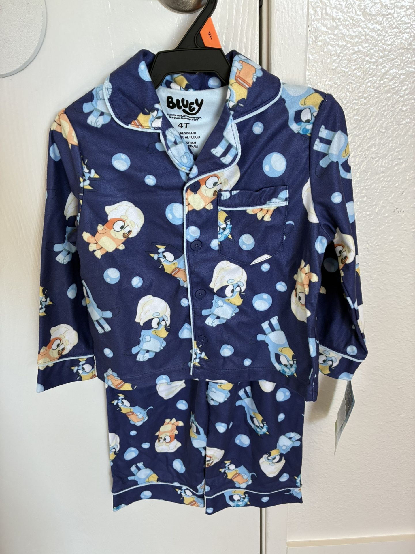 Brand new Bluey pajama set, never worn and still has the tags on it. Dark blue set with all-over Bluey characters and a button-up pajama top. Soft material and comfy fit — perfect for bedtime or lounging. Would also make a great gift for a Bluey fan. Condition: • New with tags • No stains, holes, or wear Details: • 2-piece set (top + pants) • Button-up top • Elastic waist pants • Sizes available : 4T 3T 2T