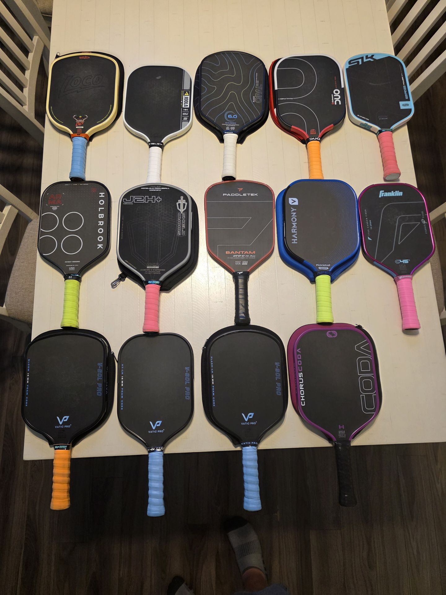 B&B Loco widebody - $120 Jolla Scorpeus IV 16mm - $80 Six Zero Black Opal - $120 Enhanced Duo widebody - $120 SLK Era Power Elongated - $80 Holbrook Arma Elongated - $60 Honolulu J2H+ - $60 Paddletek Bantam GTO 14mm hybrid-$80 Apes Pickleball Harmony widebody-$70 Franklin Parris Todd hybrid- $110 Vatic V-Sol Pro Bloom - $60 Vatic V-sol Pro V7 LH - $50 Vatic V-Sol Pro Flash - $60 Chorus Coda hybrid- $130 All paddles are in great condition. I am having knee surgery and I wont be playing for a long while, so I decided to do a paddle dump. You must pick up paddles. I will not deliver. Cash only.