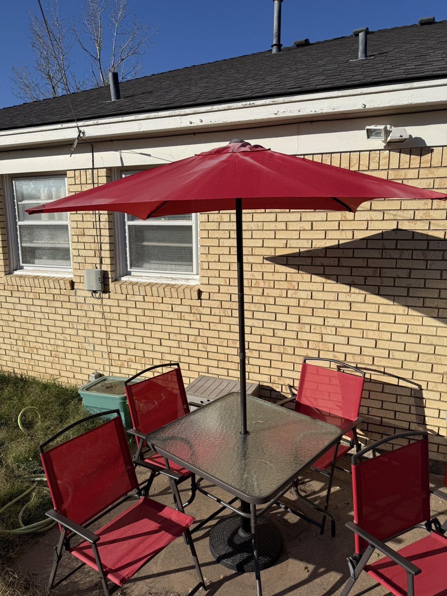 Patio Table 4 Chairs Umbrella Base Holder for umbrella Excellent condition Umbrella does have some sun fading