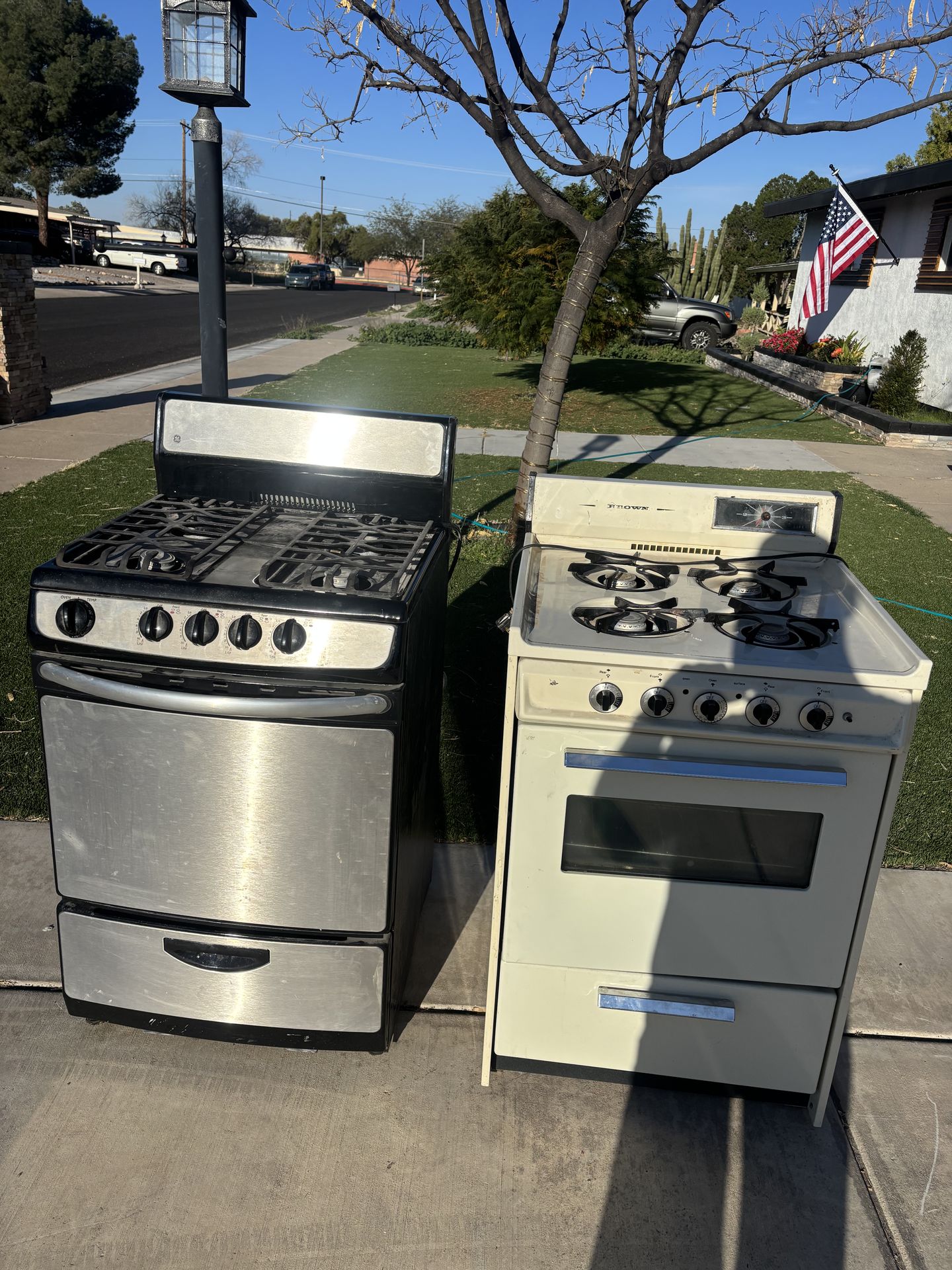 One GE 24 inch black and stainless apartment size gas stove Also almond 24 inch apartment size gas stove