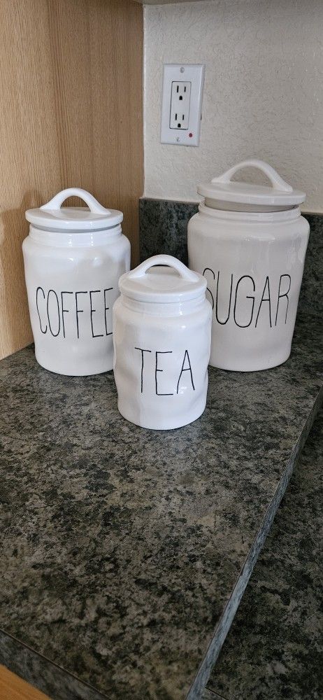 Beautiful kitchen décor canister set with 3 matching containers labeled Tea, Sugar, and Coffee. ✔️ Never used ✔️ Brand new – open box only ✔️ Clean, modern design ✔️ Perfect for countertop organization and kitchen décor Canisters are in excellent condition and no damage.