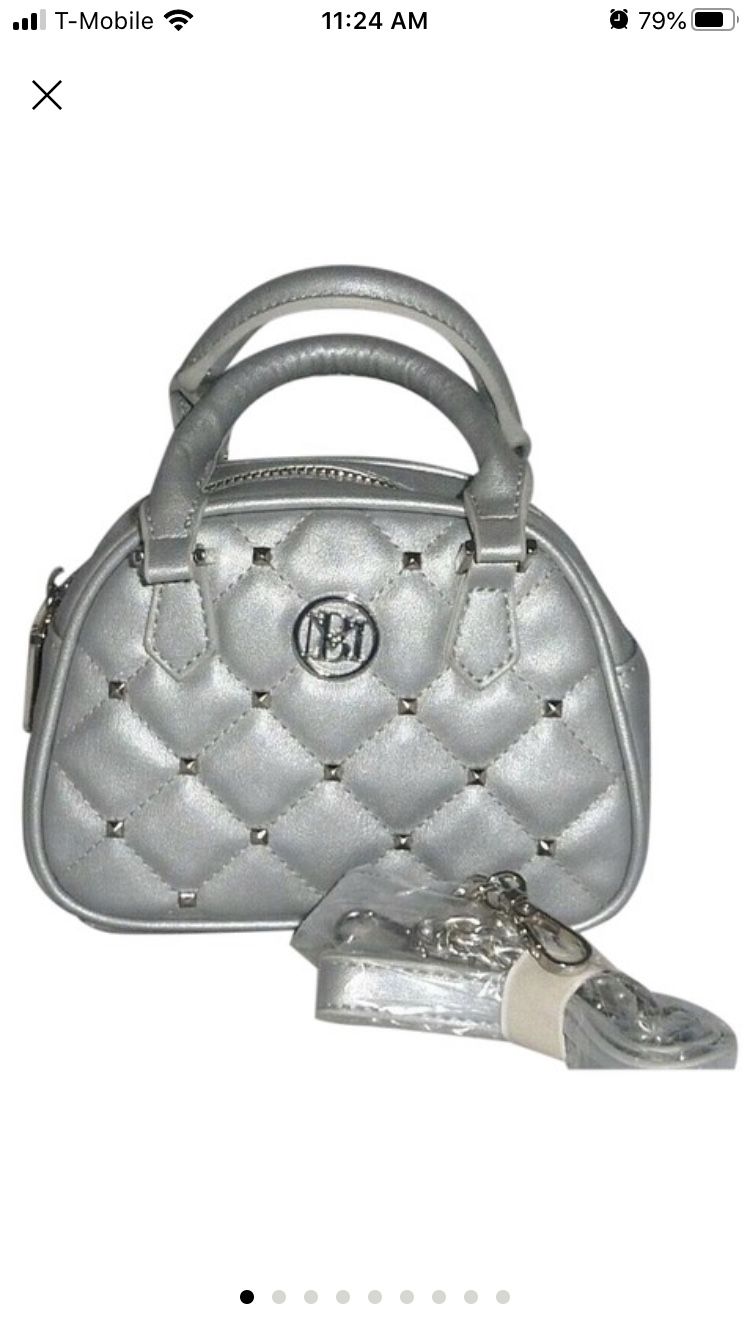 Badgley Mischka Crossbody Dome Bag in Metallic Grey Although this is a mini/small bag, but it has lot of room to carry all your essentials. It has quilted design on front with silver studs accent. Interior has a zipper pocket with logo zipper pull and a slip pocket. It makes a great and stylish evening bag. Condition: New with Tags Measurements: 7" L x 5" H x 2".75 D dual handle with a drop of 3".75 Crossbody strap with a drop of 21" Smoke pet free home