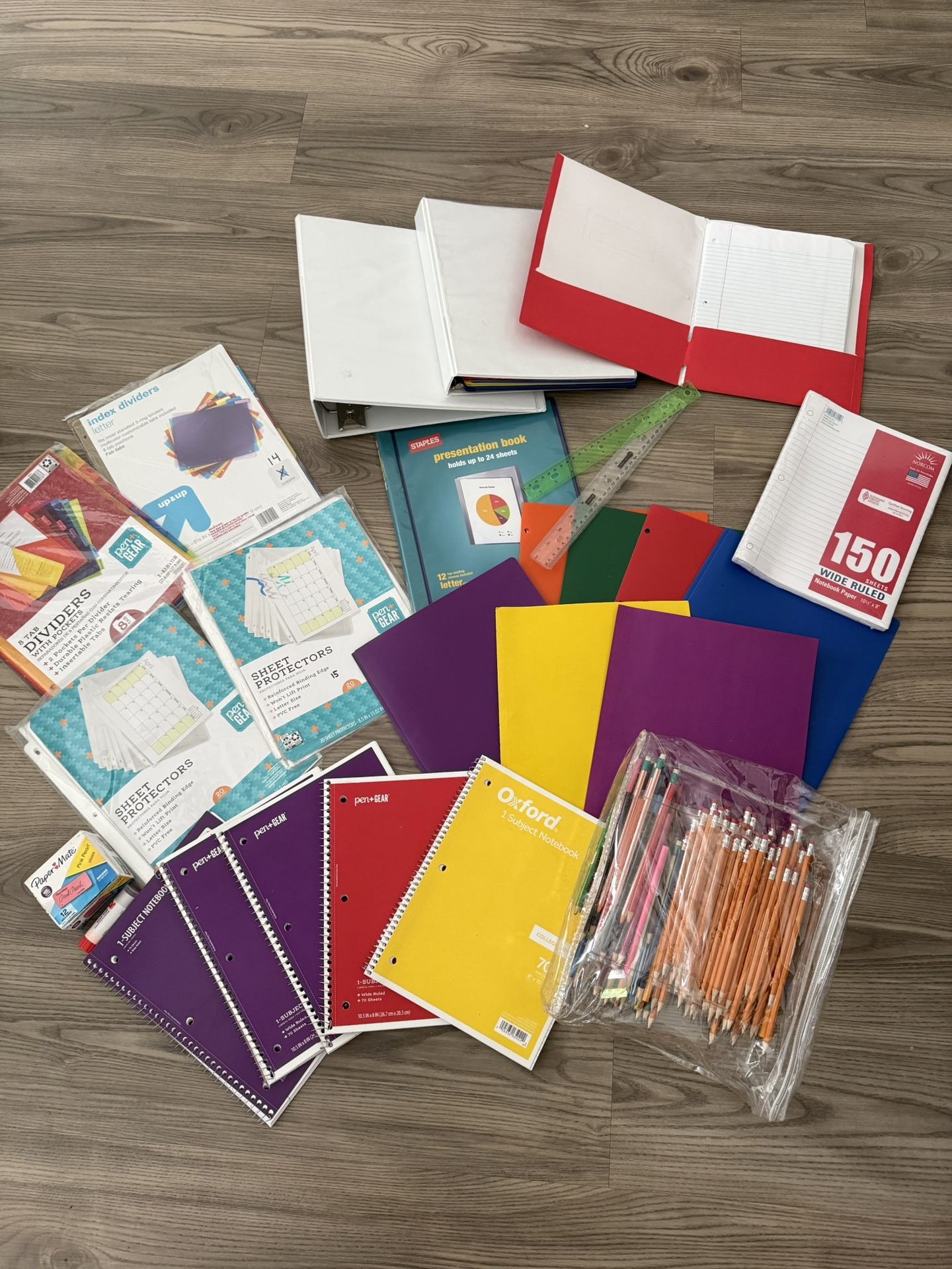 • White Pen+Gear 1" 3-Ring Standard Binder & 5 Plastic colored folder for every subject- Used good quality • White Heavy Duty Binder, 4" -New • 2-Packs New & Like New Sheet Protectors • 1- Staples High School or college Presentation Book- New • 2- Packs Binders Dividers + extras inside package- New • 2- Packs 150 Sheets Notebook Pack & extra inside red folder- New • 1- Clear Ruler- New • 2- Pink Eraser & 1 Glue stick- New • New Box of pencil sharpen bought in Amazon- New • 1- Colored Pencils Classroom Pack- Used good condition 📌I will add more items to this bundle as I find them.Check out the rest of my listing page. Let me know if you’re interested in anything else.