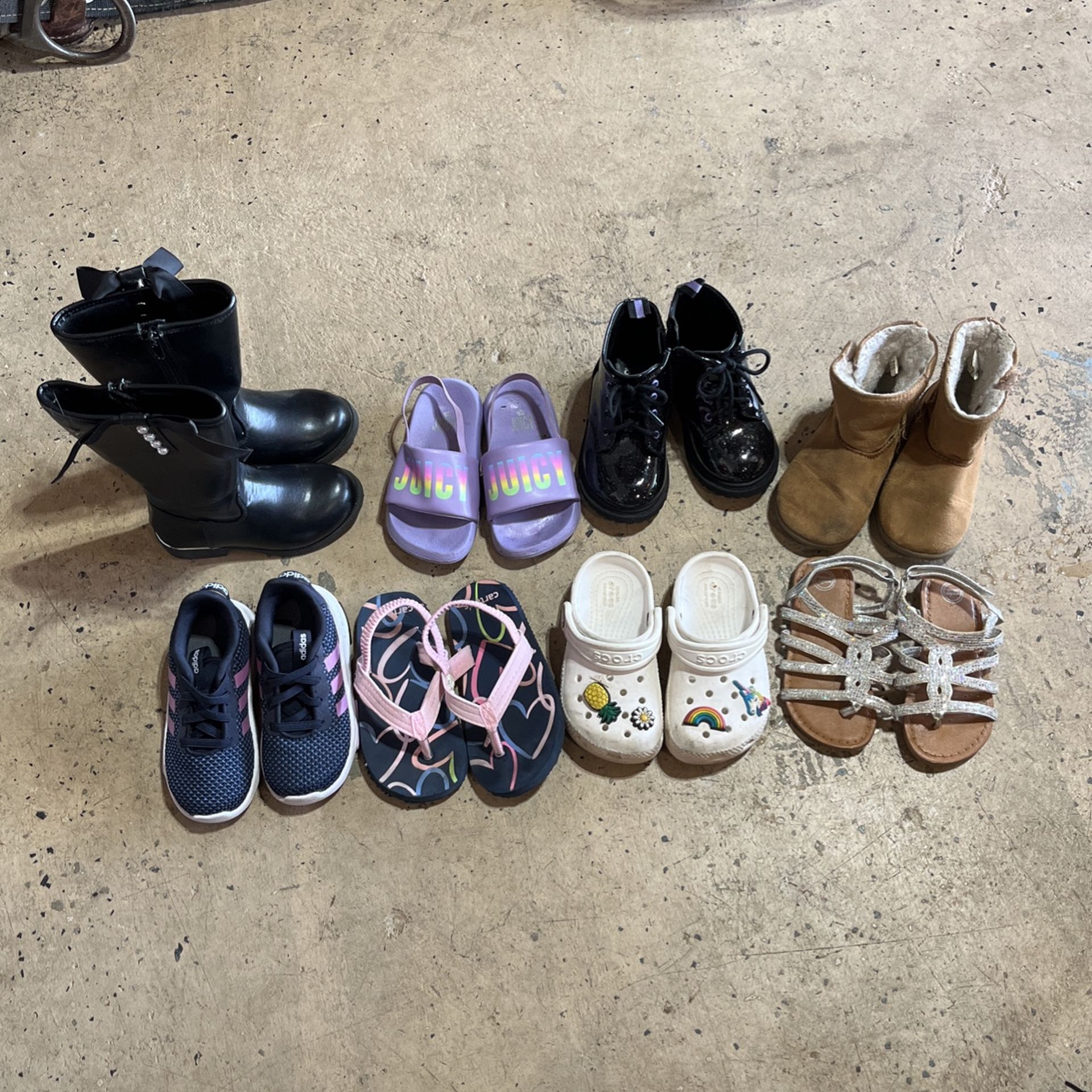 NOT SOLD SEPARATELY please refer to pictures for condition of the items Glitter sandals size 7 Brown boots size 6 Black and purple combat boots size 6 Crocs size 7 Juicy Sandals size 7/8 Black boots size 7 Adidas size 7 Carter Sandals size 7/8