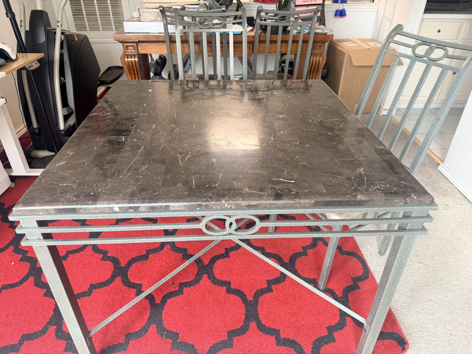 Selling this contemporary dining table and chair set. Has a marble top and a metal base. Comes with 4 chairs. They all have a clear plastic to protect the chairs. The frames for both the table and the chairs are metal, likely iron or steel, with a grayish finish. In great condition. Table Size is 42x42x30
